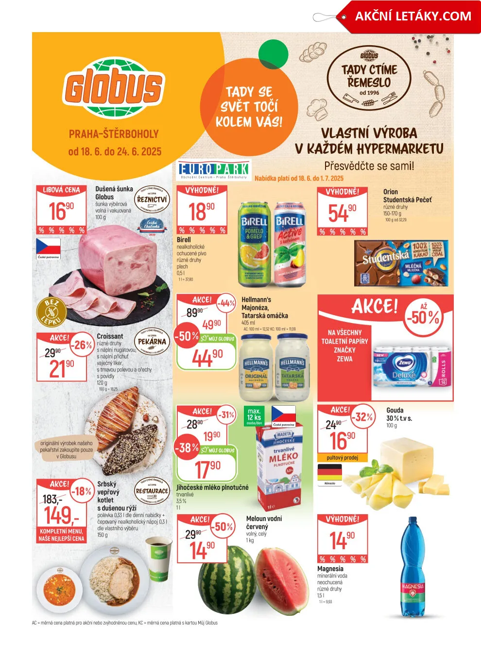 V letáku obchodu Globus od 18.6. do 24.6.2025 najdete širokou nabídku výhodných produktů. Mezi nimi se objevuje dušená šunka za skvělou cenu 49,90 Kč, a to v kvalitním řeznictví. Nezapomeňte také na akční nabídku nealkoholického piva Birell, které je k dostání v různých příchutích.
