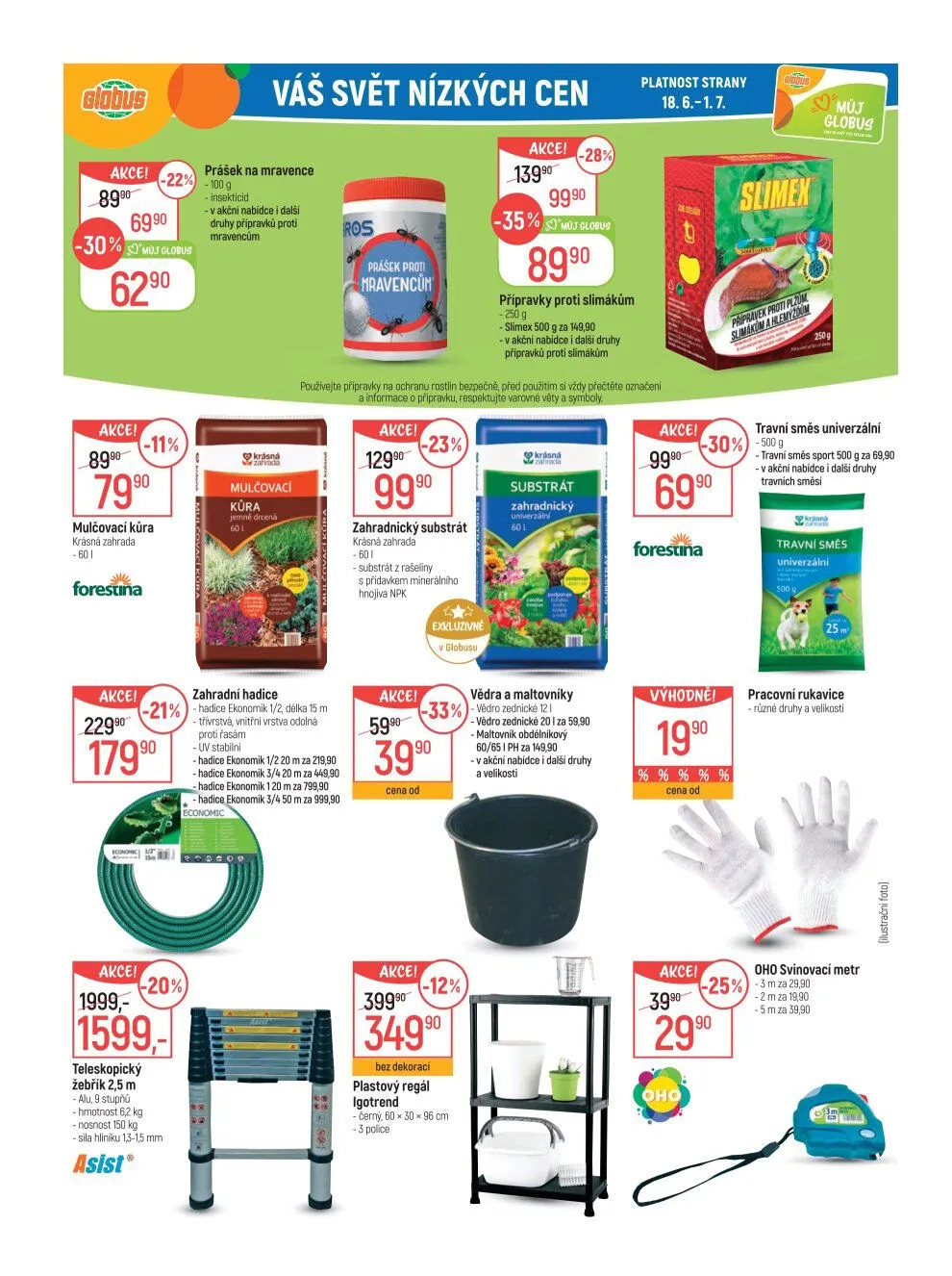 V letáku obchodu Globus najdete širokou nabídku produktů za nízké ceny, platnou od 18.6. do 1.7. Mezi akčními položkami se objevují například mulčovací kůra, zahradnický substrát a různé přípravky na ochranu rostlin.