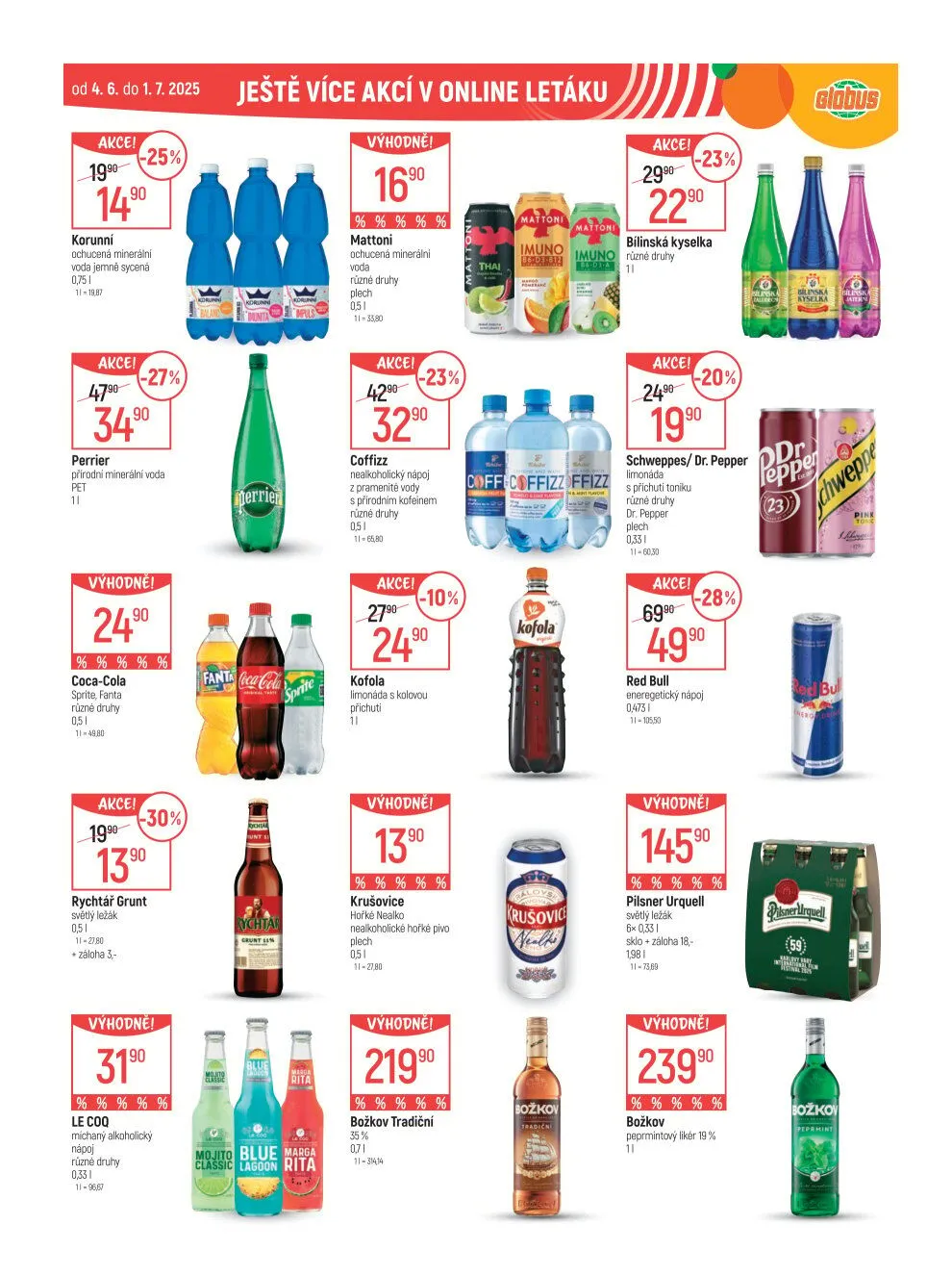 V letáku obchodu Globus najdete skvělé akce na široký výběr nápojů! Od 4.6. do 1.7.2025 si můžete pořídit ochucené minerální vody Perrier za 24,90 Kč, nebo Coca-Colu, Sprite a Fantu v různých druzích za 9,90 Kč. Nezapomeňte na Rychtář Grunt ležák za 9,90 Kč a Mattoni ochucené minerální vody také za 9,90 Kč.