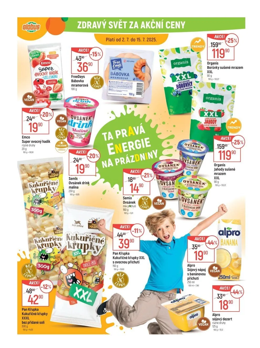 V letáku obchodu Globus najdete širokou nabídku zdravých produktů za akční ceny, které platí od 2.7. do 15.7.2025. Mezi nimi se objevují lahodné ovocné hadíky od značky Emco v různých druzích, které potěší každého milovníka zdravých snacků.