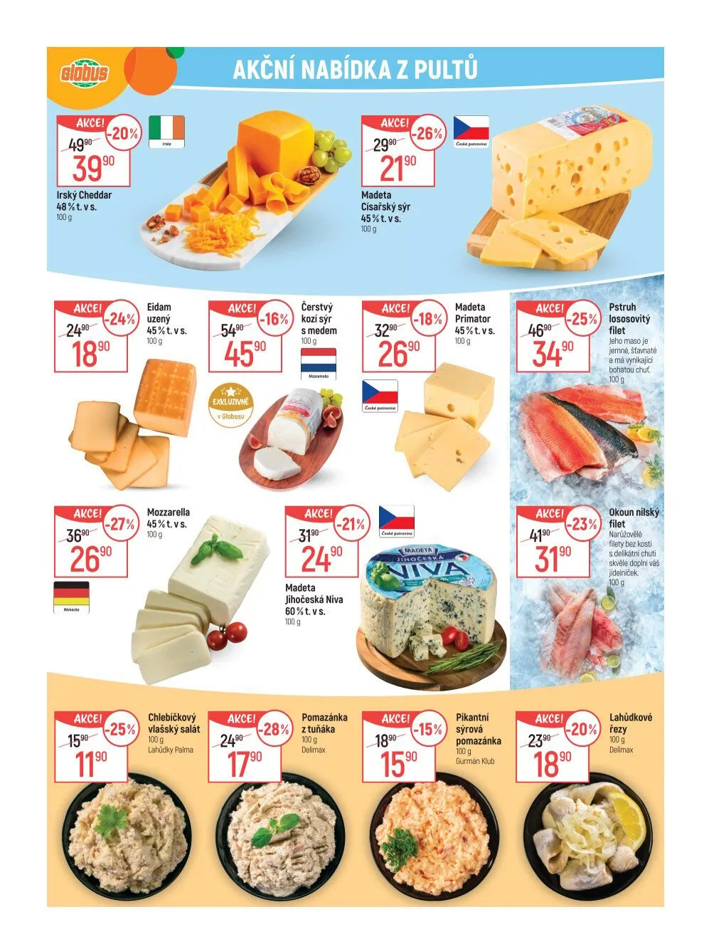 V letáku obchodu Globus najdete skvělé akční nabídky z pultů. Mezi nimi se objevují irský cheddar za 39,90 Kč, uzený eidam a mozzarella, oba s 45% obsahem tuku, za 90 Kč za 100 g. Nezapomeňte také na lahůdky jako čerstvý kozí sýr s medem a madeta císařský sýr, oba s 45% tuku, za 26,90 Kč. Pro milovníky ryb je tu pstruh lososovitý filet a okoun filet, které vás potěší svou jemnou chutí. Využijte tyto skvělé akce a obohaťte svůj jídelníček!