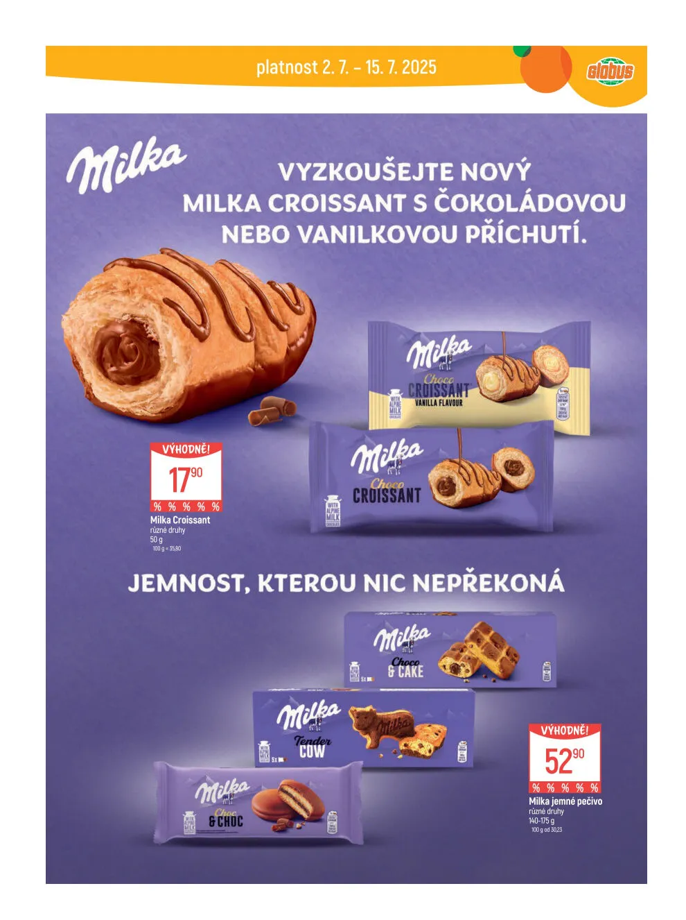 V letáku obchodu Globus na období od 2.7. do 15.7. 2025 najdete skvělou nabídku nových produktů. Vyzkoušejte lahodný Milka croissant s čokoládovou nebo vanilkovou příchutí, který vás okouzlí svou jemností.