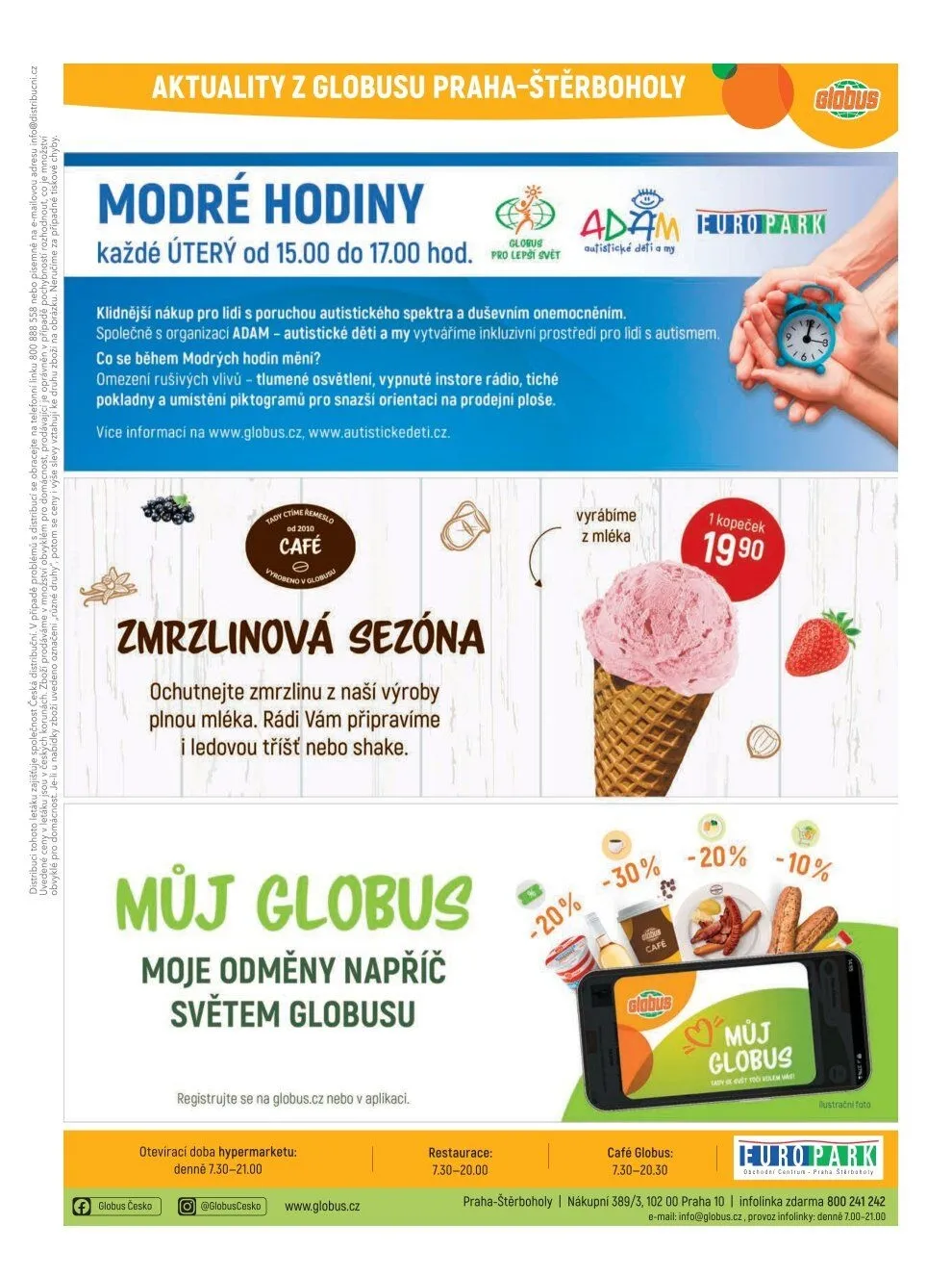 V Café Globus si můžete vychutnat zmrzlinu z vlastní výroby, ledovou tříšť nebo shake. Otevírací doba hypermarketu je denně od 13:00 do 21:00, restaurace je otevřena od 7:30 do 20:00. Nezapomeňte se registrovat na globuscz nebo v aplikaci pro získání odměn.