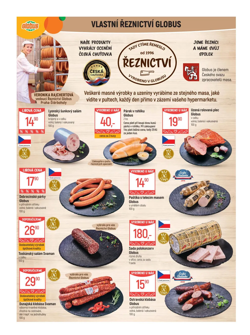 V letáku obchodu Globus najdete širokou nabídku kvalitních masných výrobků a uzenin, které jsou vyráběny přímo v zázemí hypermarketu. Naše řeznictví, které ctí tradiční řemeslo od roku 1996, nabízí oceněné produkty jako je lyonský šunkový salám, debrecínské párky a ostravská klobása.