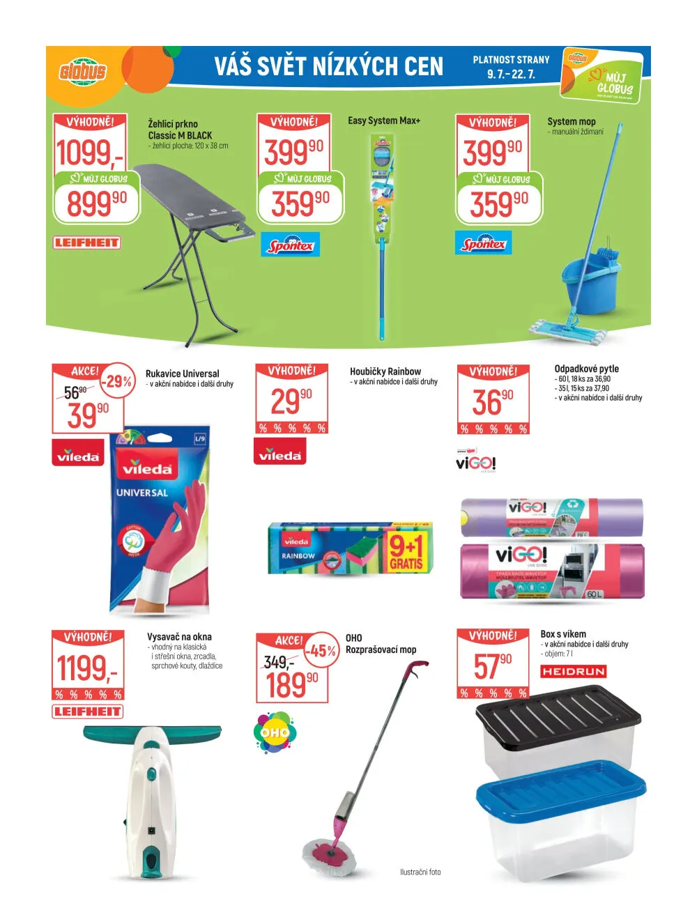 V letáku obchodu Globus najdete širokou nabídku výhodných produktů, které potěší každého zákazníka. Mezi nimi se nachází žehlicí prkno Classic M Black za 399,90 Kč, které je ideální pro každodenní žehlení. Dále nabízíme univerzální rukavice a rozprašovací mop Easy System Max za 299,90 Kč, který usnadní úklid.