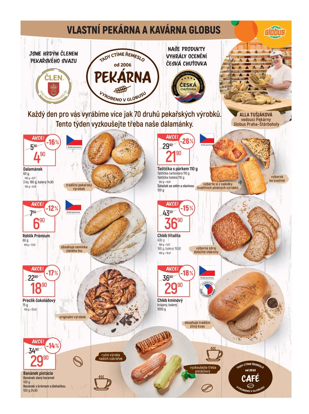 V letáku obchodu Globus najdete širokou nabídku pekařských výrobků, které jsou vyráběny s láskou a péčí. Každý den pro vás připravujeme více než 70 druhů, mezi nimiž vynikají naše lahodné dalamánky, které si můžete nyní pořídit za akční cenu.