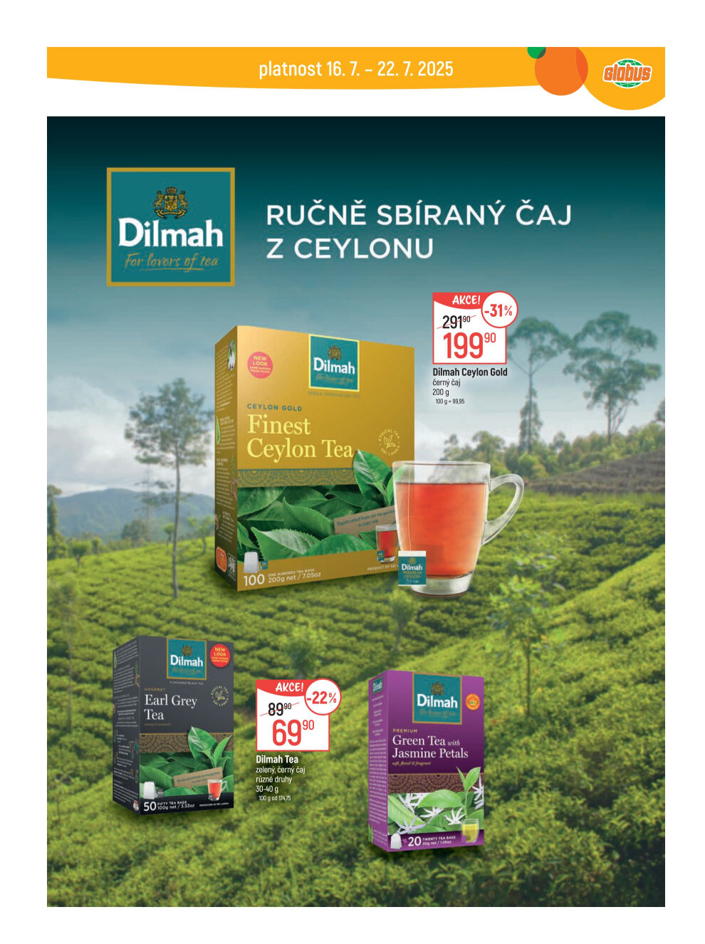 V letáku obchodu Globus na období od 16.7. do 22.7.2025 najdete skvělé nabídky na produkty značky Dilmah. Můžete si pořídit ručně sbíraný čaj z Ceylonu, který je nyní k dispozici se slevou 31 %. Dále je v nabídce černý čaj Dilmah Ceylon Gold v balení 200 g. Nezapomeňte také na zelený čaj Dilmah, který potěší všechny milovníky kvalitního čaje. Navštivte nás a objevte tyto skvělé produkty za výhodné ceny!