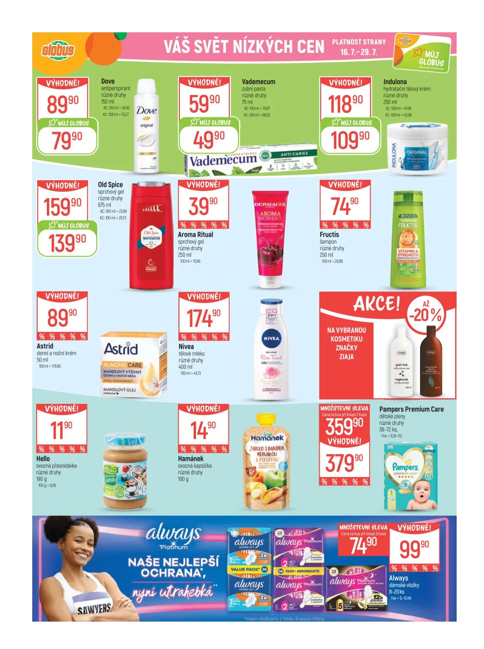 V letáku obchodu Globus najdete širokou nabídku výhodných produktů, které potěší vaši peněženku. Mezi nimi jsou například denní a noční krémy Astrid, sprchové gely Old Spice a aroma ritual, nebo zubní pasty Vademecum. Nezapomeňte také na dětské pleny Pampers Premium Care a dámské vložky Always. Všechny produkty jsou k dispozici za skvělé ceny od 90 Kč. Platnost akce je od 16.7. do 29.7. Nepropásněte tuto příležitost a nakupujte výhodně!