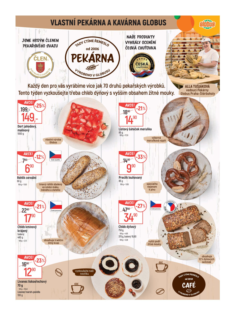 V letáku obchodu Globus najdete širokou nabídku čerstvých pekařských výrobků, které jsou vyráběny s láskou a respektem k tradičnímu řemeslu. Každý den pro vás připravujeme více než 70 druhů pečiva. Tento týden doporučujeme vyzkoušet dýňový chléb s vyšším obsahem žitné mouky za akční cenu 149 Kč.
