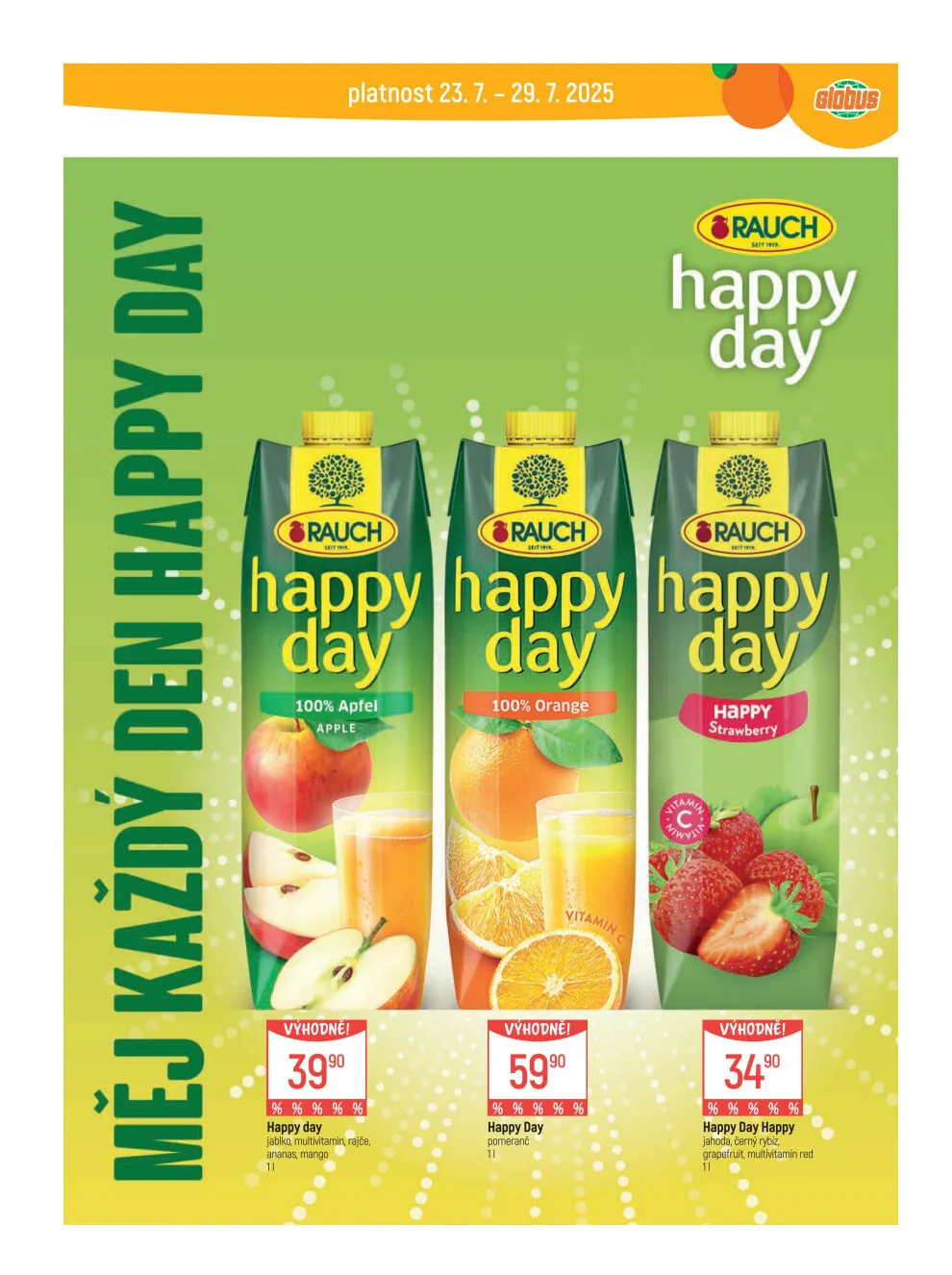 V letáku obchodu Globus najdete širokou nabídku produktů značky Happy Day. Mezi nimi se objevují 100% ovocné šťávy, jako je jablečná, pomerančová a jahodová. Tyto šťávy jsou vyrobeny z kvalitních surovin a neobsahují žádné přidané cukry. Dále si můžete vychutnat i ovocné mixy, které kombinují různé chutě, jako je mango, grapefruit a rybíz. Nezapomeňte, že akce platí od 23. 7. do 29. 7. 2025. Přijďte si pro své oblíbené nápoje a osvěžte se!