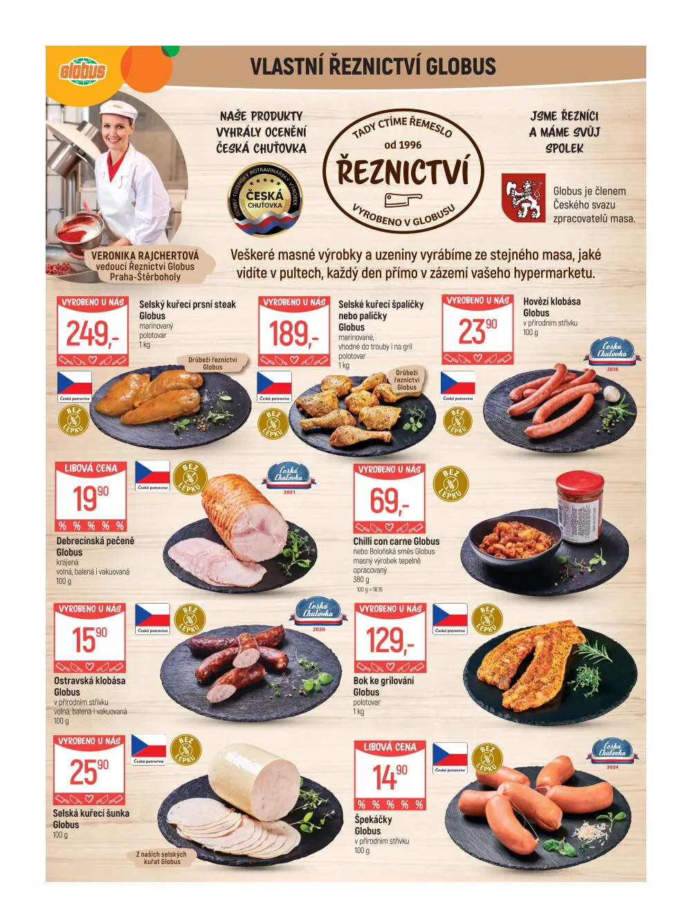 V letáku obchodu Globus najdete širokou nabídku kvalitních masných výrobků z vlastního řeznictví. Naše produkty, které ctí tradiční řemeslo, získaly ocenění a jsou vyráběny od roku 1996. Všechny masné výrobky a uzeniny vyrábíme přímo v zázemí hypermarketu, což zaručuje čerstvost a kvalitu.