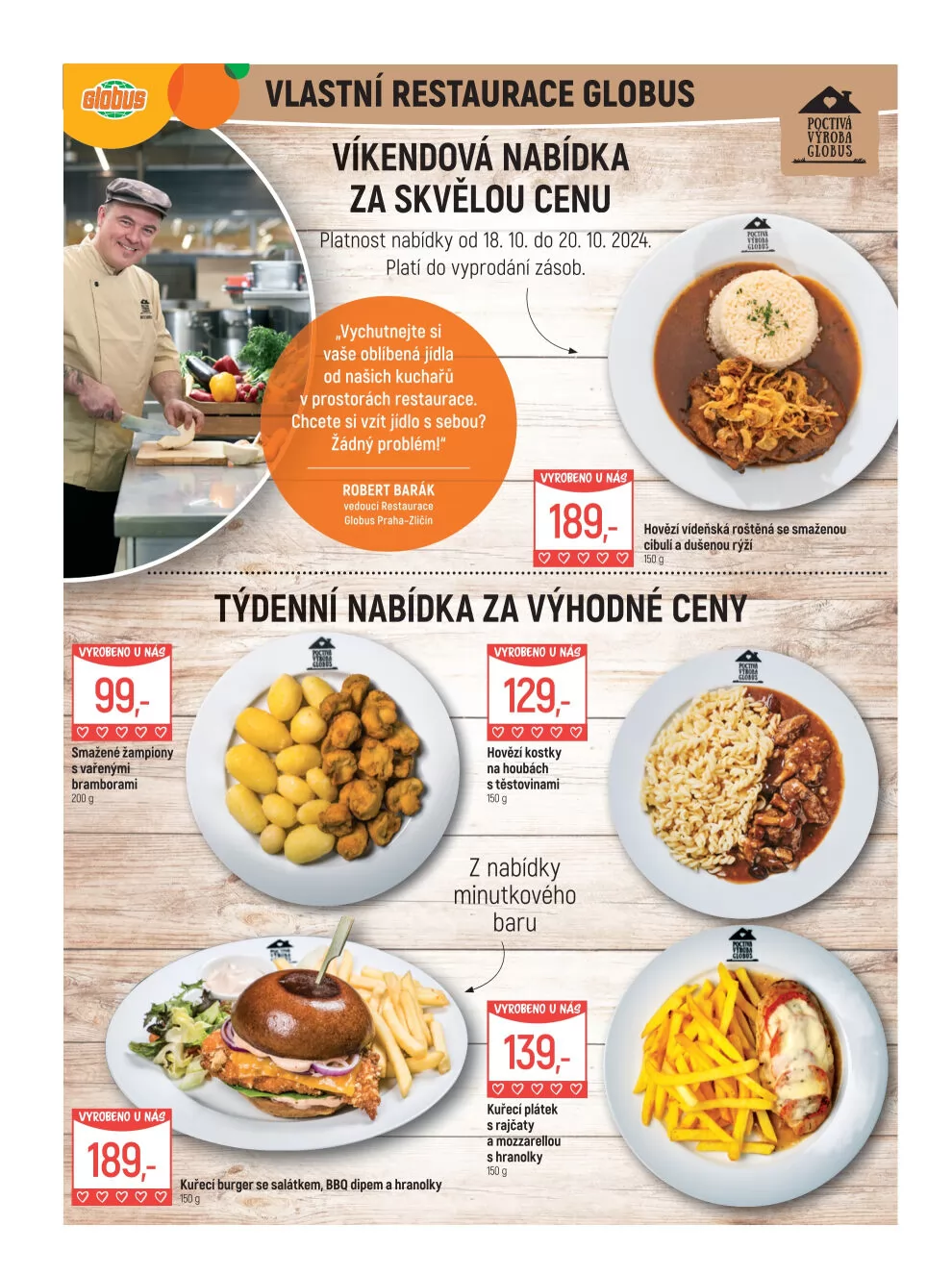V restauraci Globus vás zveme na víkendovou nabídku, která platí od 18.10. do vyprodání zásob. Vychutnejte si vaše oblíbená jídla od našich kuchařů v příjemném prostředí. Pokud si chcete jídlo vzít s sebou, není to žádný problém!
