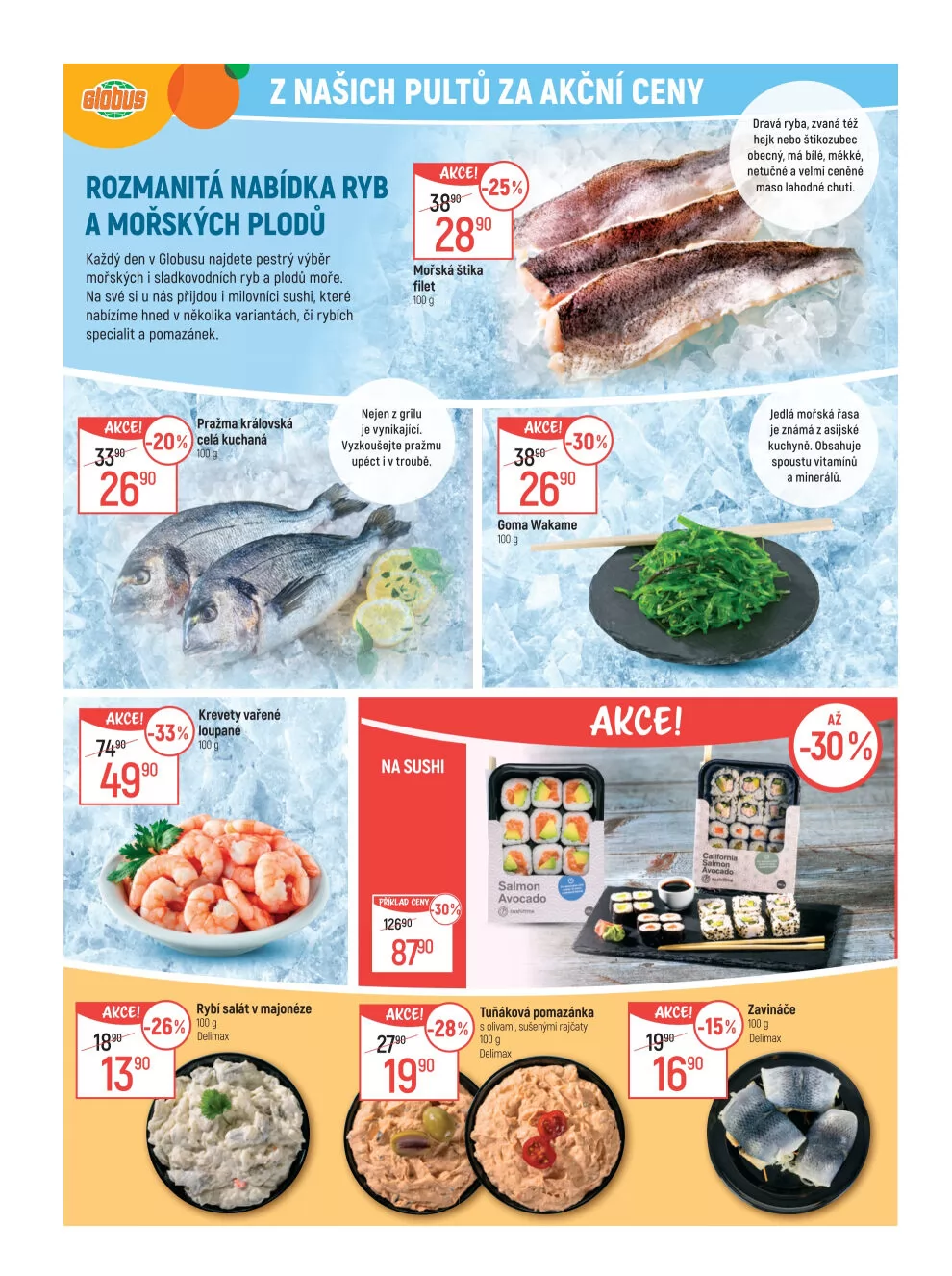 V letáku obchodu Globus najdete rozmanitou nabídku ryb a mořských plodů, které jsou k dispozici každý den.