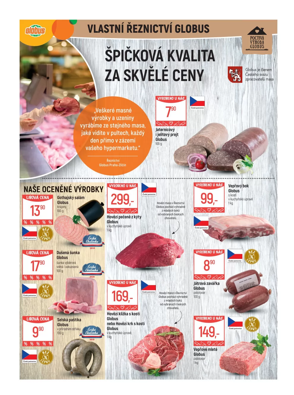 V letáku obchodu Globus najdete širokou nabídku kvalitních masných výrobků z vlastního řeznictví. Naše spičková řeznictví vyrábí veškeré masné výrobky a uzeniny přímo v zázemí hypermarketu, což zaručuje čerstvost a kvalitu.