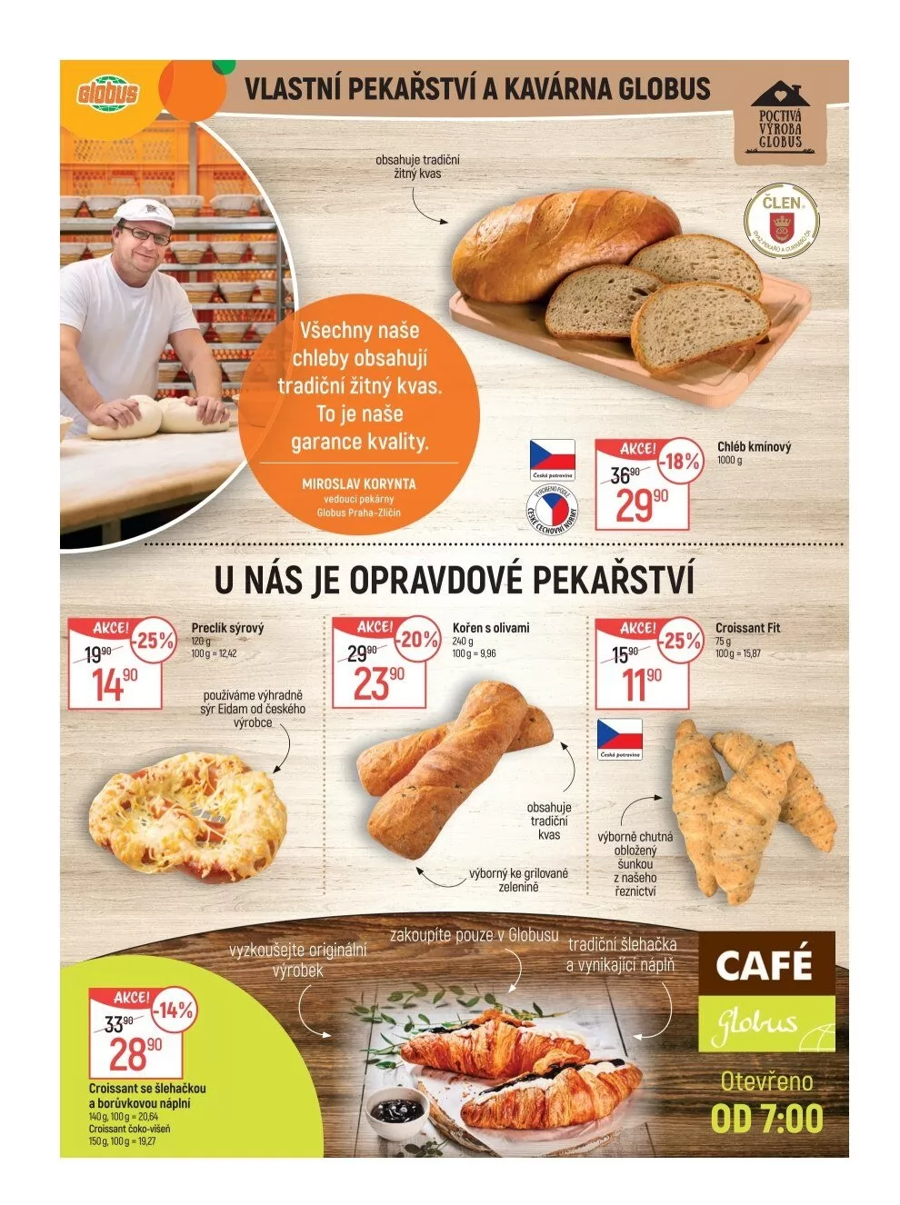 Aktuálně máme v akci sýrový preclík a chléb s olivami, které si můžete zakoupit za skvělé ceny. Nezapomeňte také ochutnat naše croissanty – croissant se šlehačkou a borůvkovou náplní nebo croissant s višní.