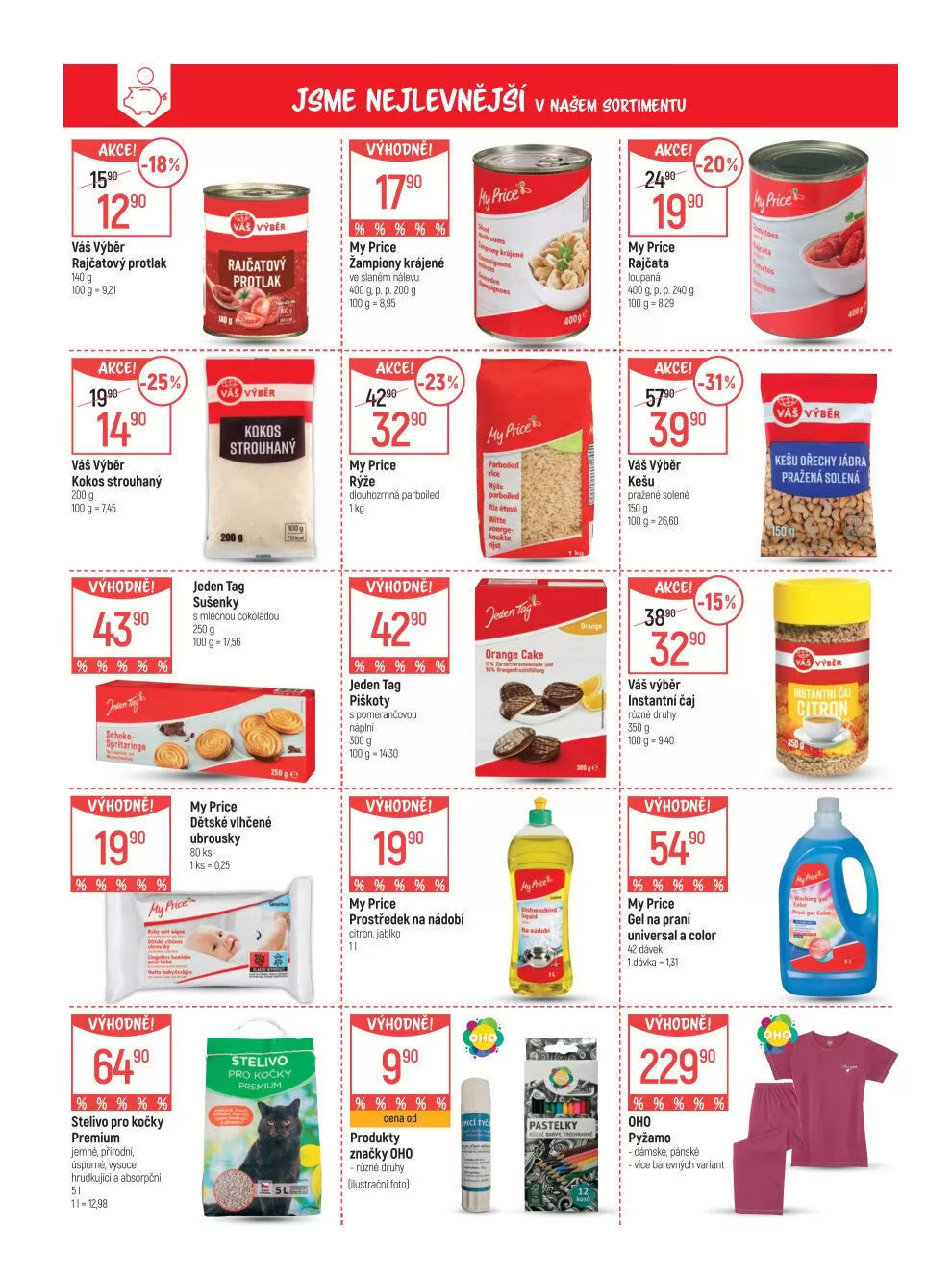 Mezi nimi je rajčatový protlak 141 g za skvělou cenu 14,90 Kč a kokos strouhaný 200 g za 9,90 Kč.
