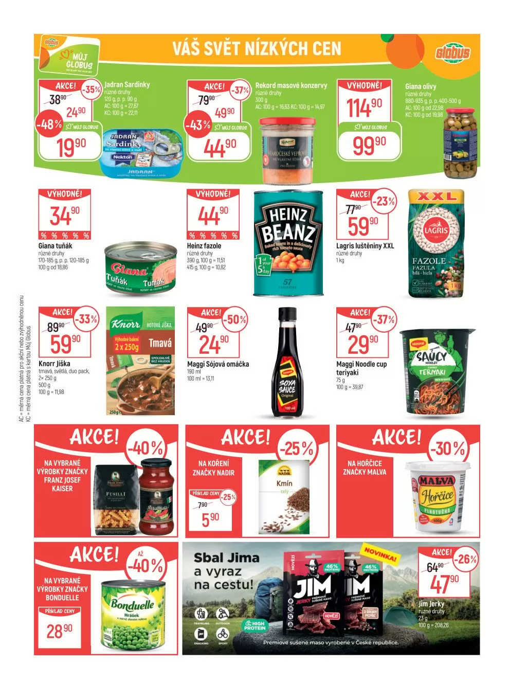 Heinz fazole a Maggi sójová omáčka (190 ml) jsou také v akci, stejně jako masové konzervy od značky Rekord (300 g).
