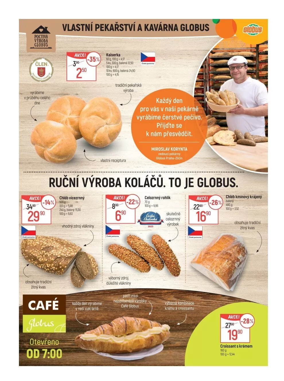 Dále nabízíme celozrnné rohlíky, které jsou výborným zdrojem důležité vlákniny, a kmínový chléb, který je také v akci. Nezapomeňte ochutnat naše lahodné croissanty s krémem!