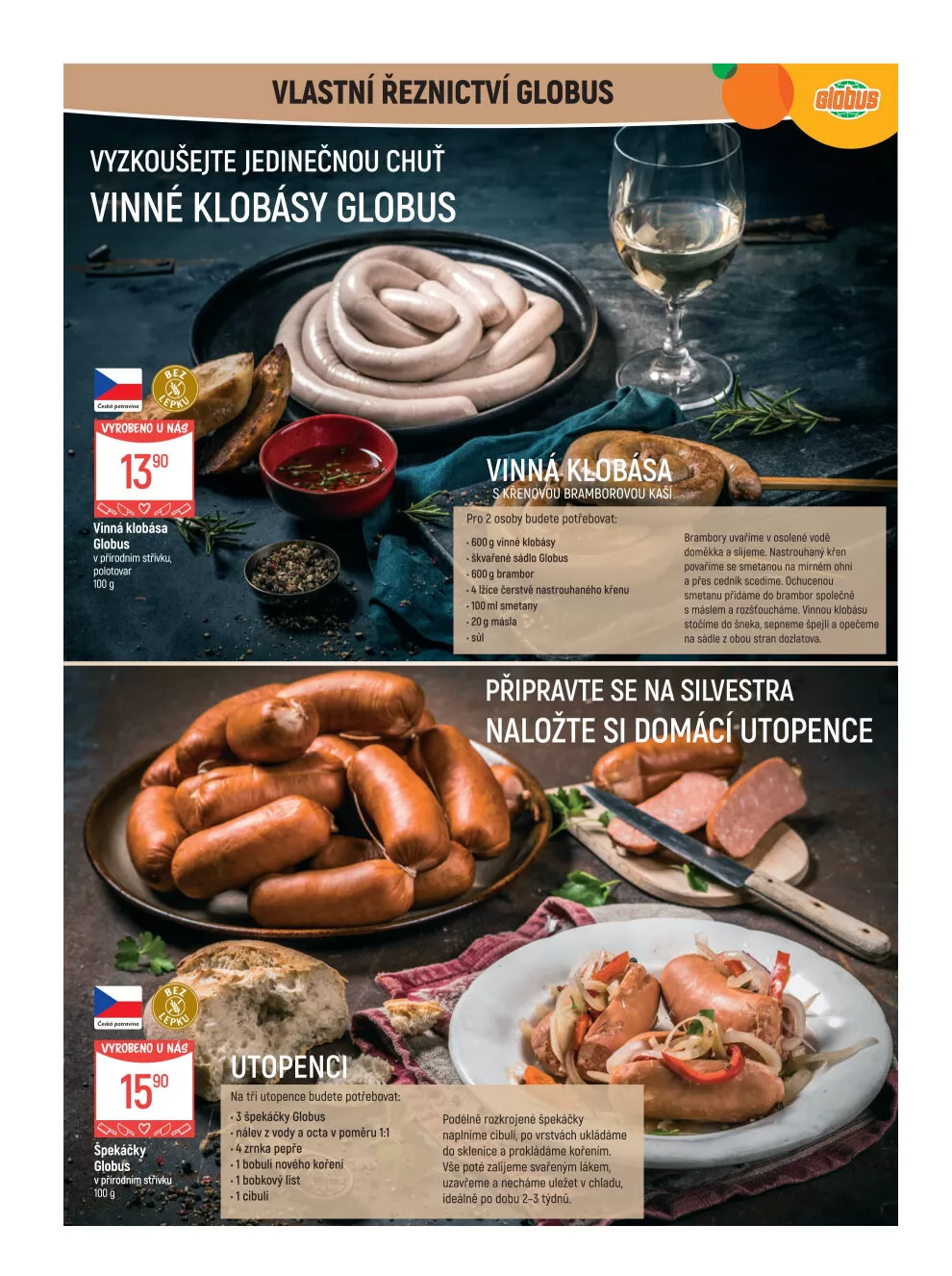 V obchodě Globus najdete širokou nabídku kvalitních produktů z vlastního řeznictví. Vyzkoušejte jedinečnou chuť vinné klobásy Globus, která je balena v přírodním střívku. Pro přípravu chutného jídla pro dvě osoby budete potřebovat 600 g vinné klobásy, brambory, čerstvý křen, smetanu, máslo a sůl. Brambory uvařte, ochuťte smetanou a máslem a vinnou klobásu opečte dozlatova.