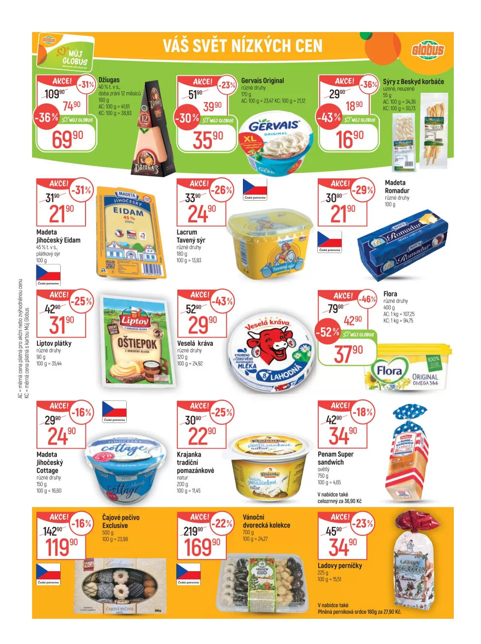 Mezi akčními položkami se objevují různé druhy sýra Gervais Original se slevou -23%, nyní za 69,90 Kč.
