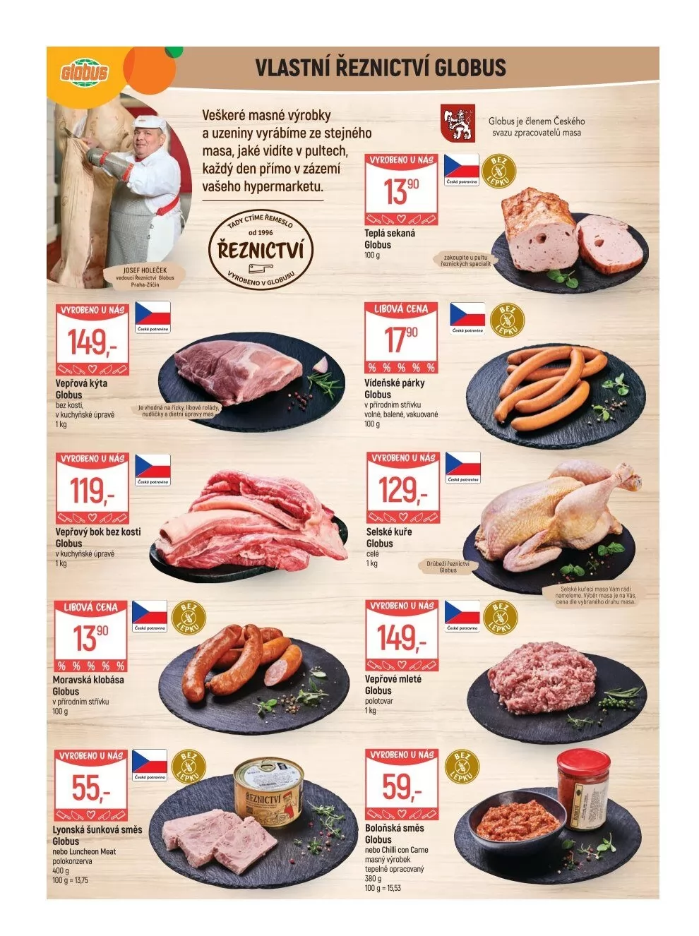 V obchodu Globus najdete širokou nabídku masných výrobků a uzenin, které jsou vyráběny přímo v zázemí hypermarketu. Od roku 1996 ctíme tradici řeznictví a nabízíme kvalitní produkty, jako je vepřová kýta za 149 Kč/kg, vepřový bok bez kosti za 119 Kč/kg, nebo moravská klobása v přírodním střívku za 55 Kč/100g.