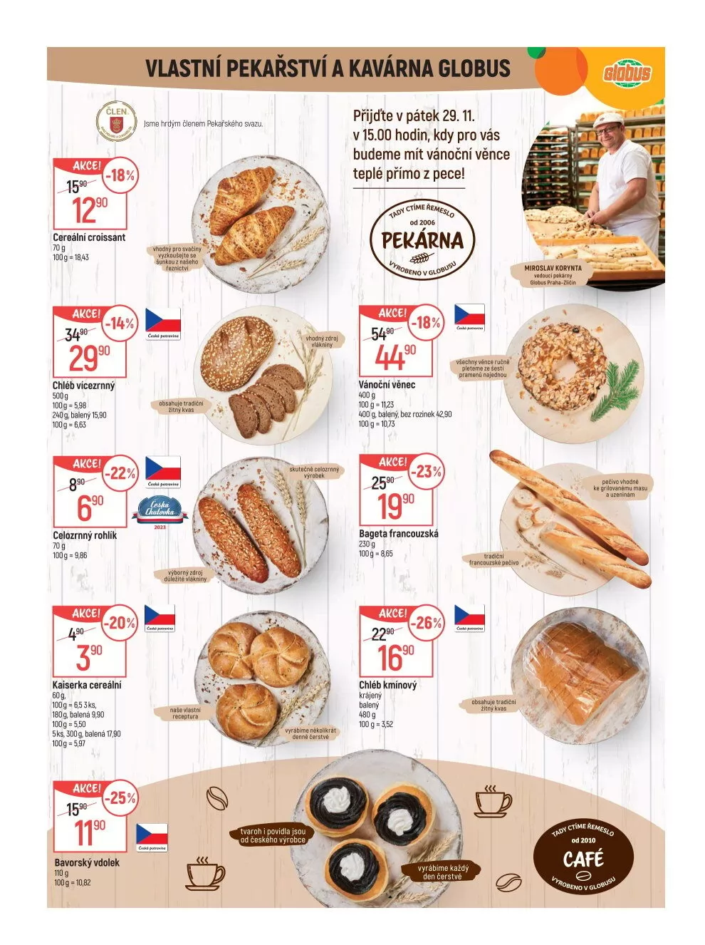 V našem vlastním pekařství a kavárně Globus nabízíme široký výběr čerstvých pekárenských výrobků. Aktuálně probíhá akce na cereální croissanty, které nyní zakoupíte se slevou 18%. Dále si můžete pochutnat na vícezrnném chlebu a celozrnných rohlících, které jsou také v akci.