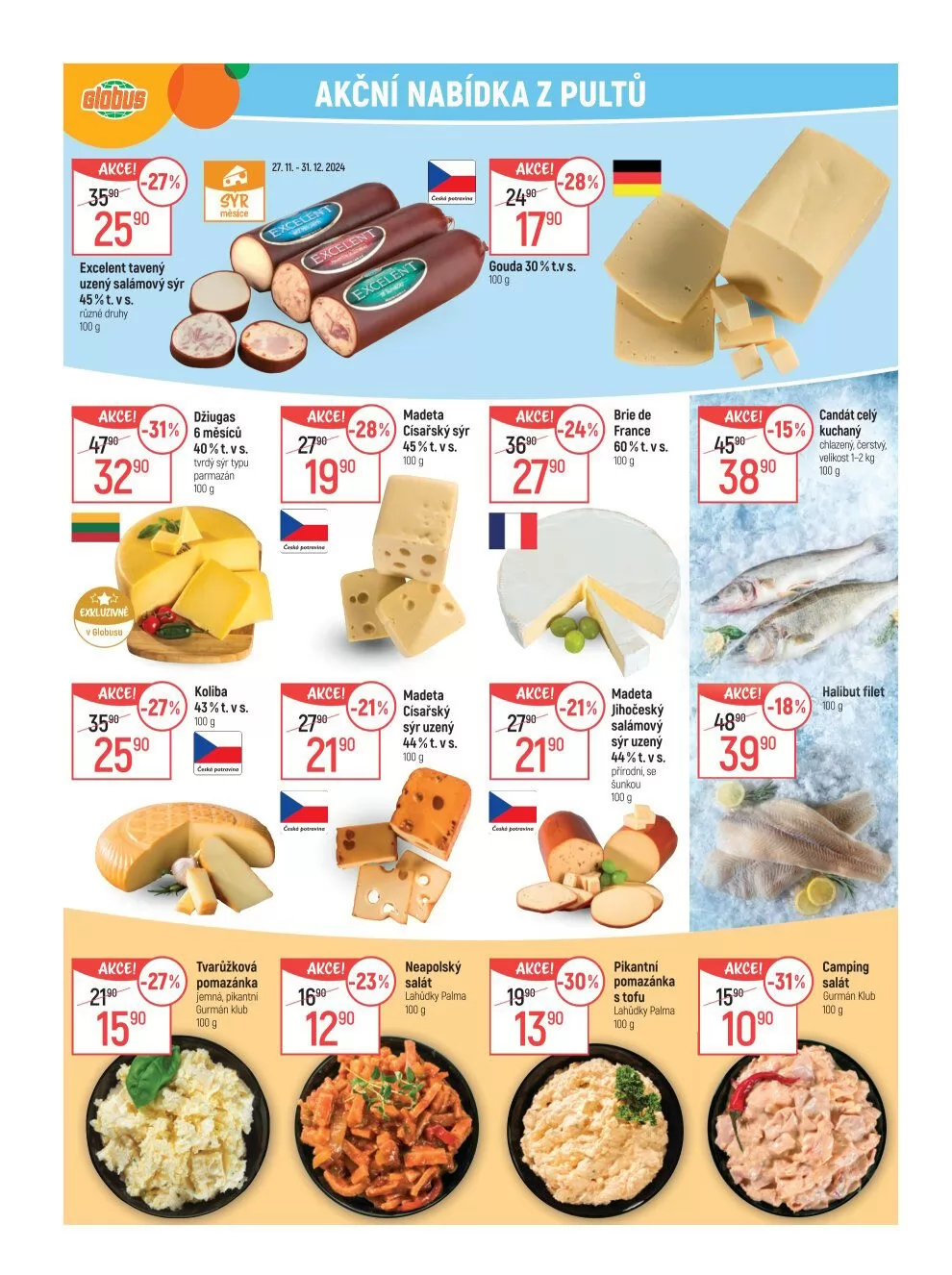 V letáku obchodu Globus najdete skvělé akční nabídky na různé produkty. Například excelentní tavený uzený salámový sýr je nyní za 25,90 Kč, což představuje slevu 18%. Dále si můžete vychutnat tvrdý parmazán s 40% tuku, který je k dostání za 90 Kč za 100 g.