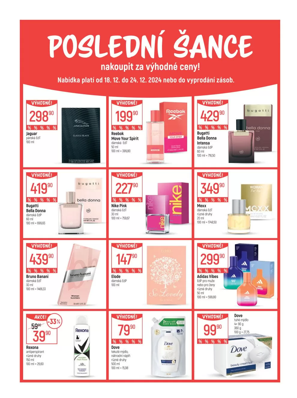 Mezi nabízenými produkty se objevují parfémy jako Jaguar (298,90 Kč), Bugatti Bella Donna (419,90 Kč) a Bruno Banani (439,90 Kč).