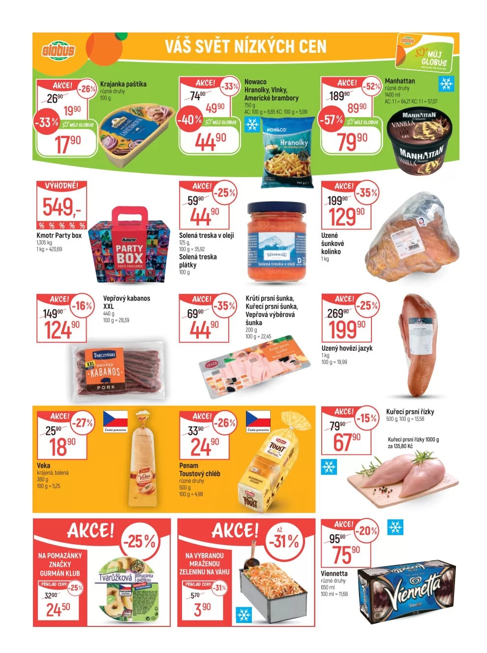 V letáku obchodu Globus najdete skvělé akce na široký výběr produktů. Mezi nimi se objevují oblíbené krajankové paštiky, které jsou nyní se slevou -26%. Nezapomeňte také na vepřový kabanos a solenou tresku v oleji, které jsou ideální na párty.