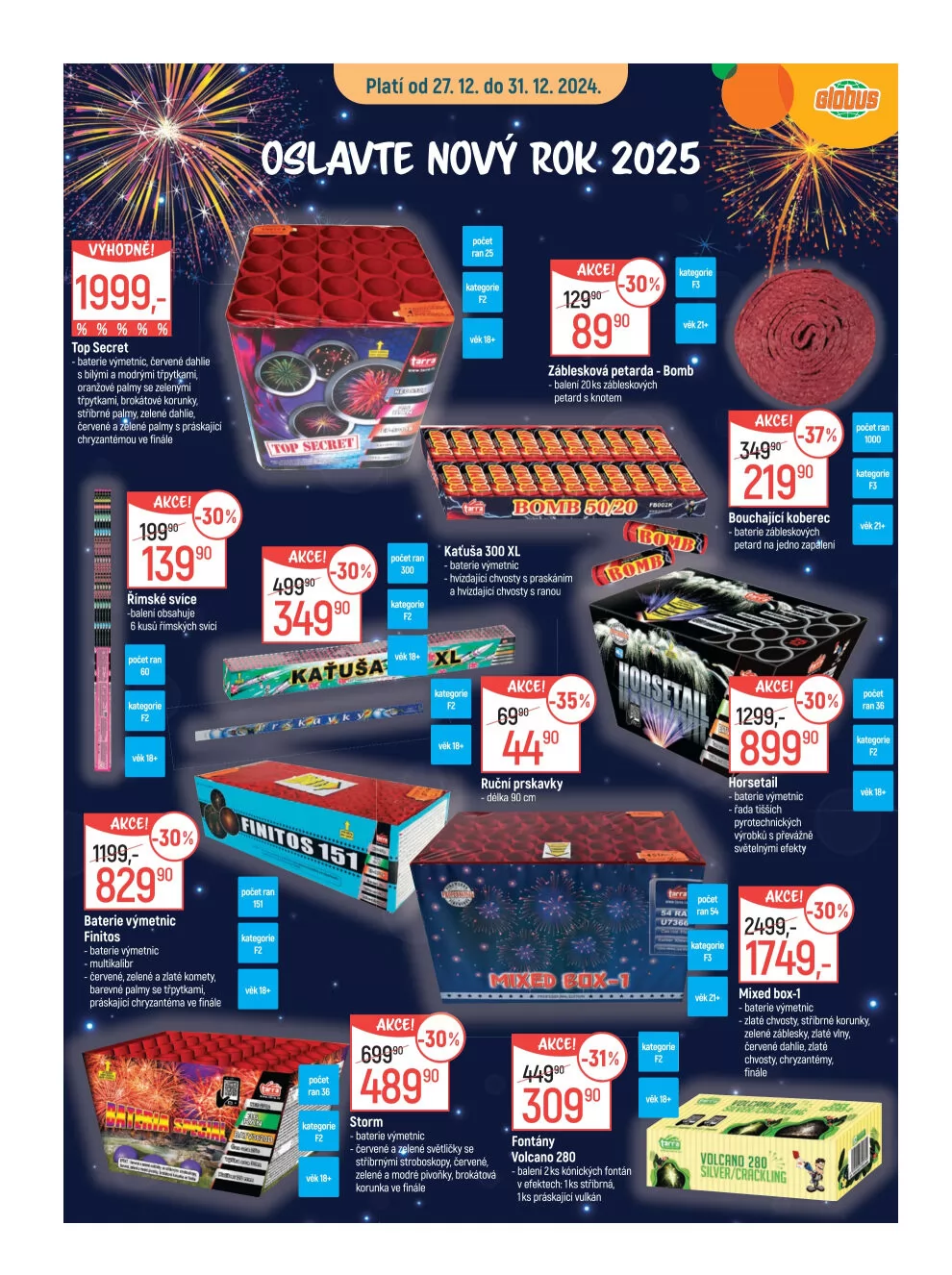V letáku obchodu Globus najdete širokou nabídku pyrotechniky, která potěší každého milovníka ohňostrojů.