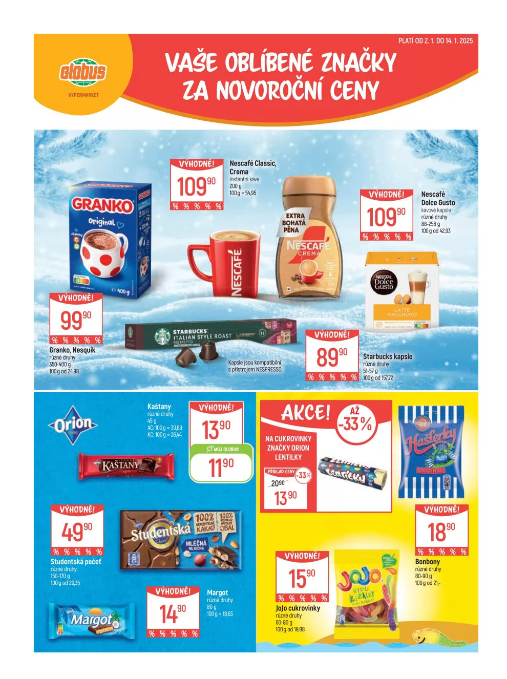 V letáku obchodu Globus najdete širokou nabídku oblíbených produktů za novoroční ceny. Od 2. ledna do 1. února 2025 si můžete pořídit Granko a Nesquik v různých druzích, balení 350-400 g za výhodnou cenu 99,90 Kč.