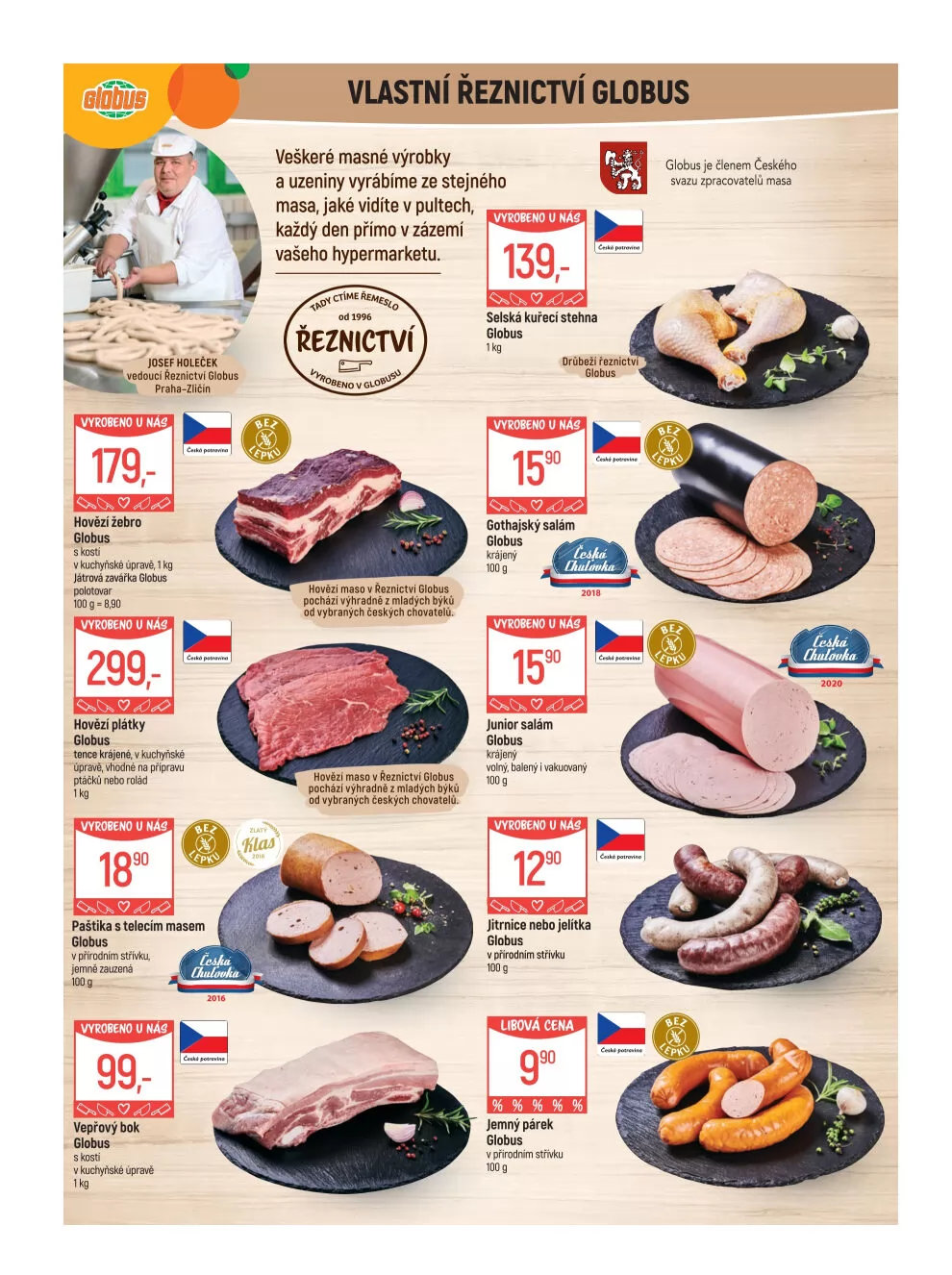 V letáku obchodu Globus najdete širokou nabídku masných výrobků a uzenin, které jsou vyráběny z kvalitního masa přímo v jejich řeznictví. Hovězí žebro s kostí je k dispozici za 179 Kč za kilogram, zatímco hovězí plátky, ideální na přípravu řízků nebo rolád, stojí 299 Kč za kilogram.