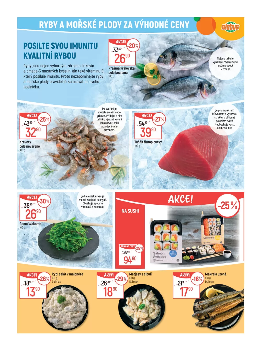 V letáku obchodu Globus najdete širokou nabídku ryb a mořských plodů za výhodné ceny. Posilte svou imunitu kvalitní rybou, která je výborným zdrojem bílkovin, omega-3 mastných kyselin a vitamínu D. Nezapomínejte pravidelně zařazovat ryby a mořské plody do svého jídelníčku.