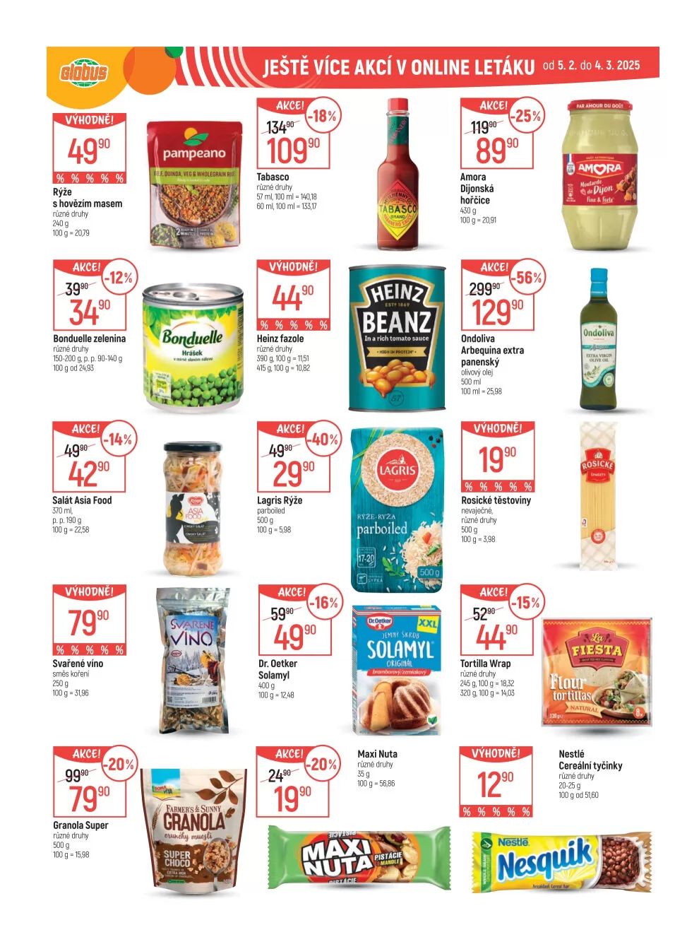 Tabasco a fazole Heinz jsou také ve výhodné nabídce, stejně jako Lagris rýže a Dr. Oetker Solamyl.