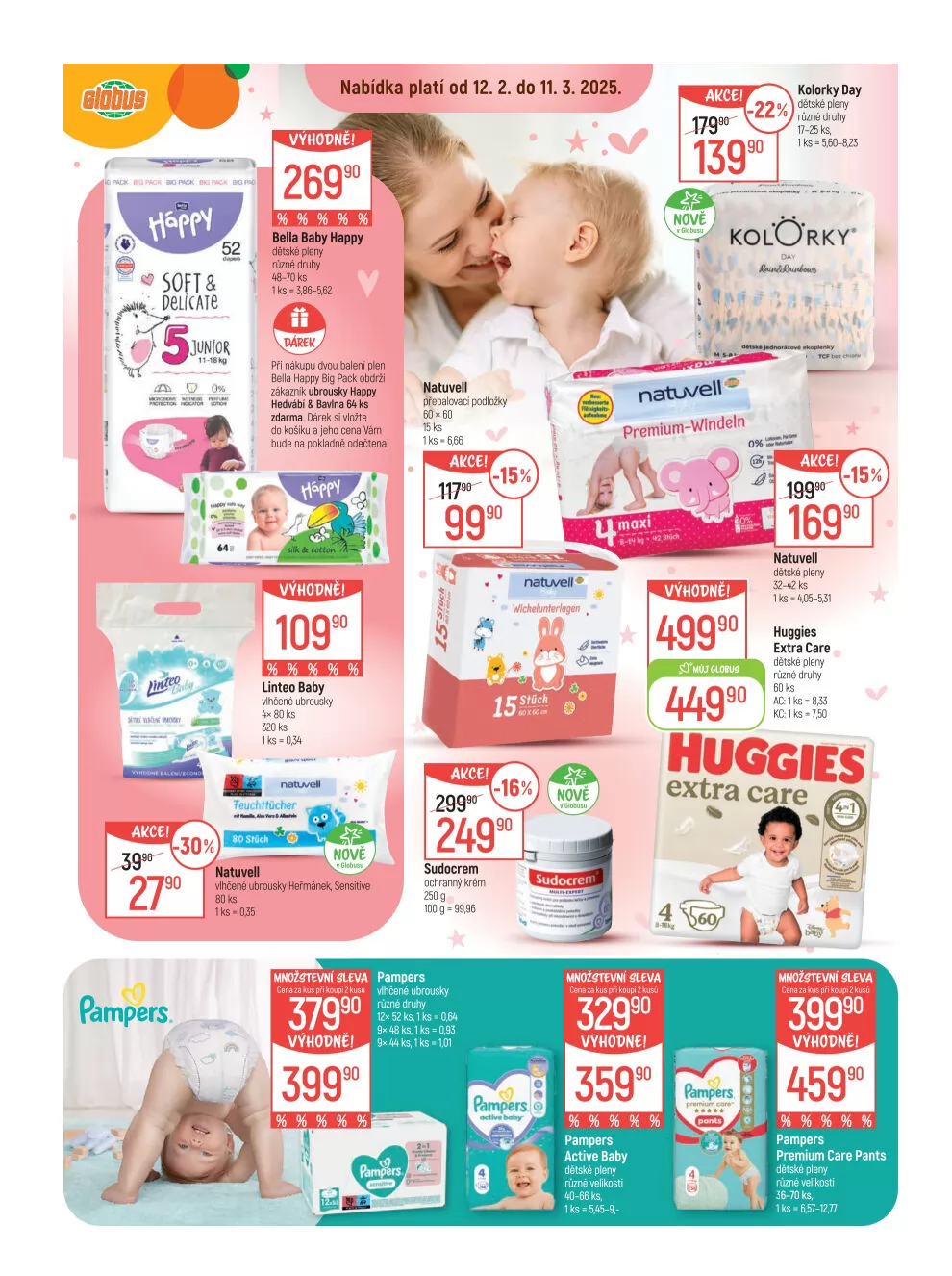 V letáku obchodu Globus najdete širokou nabídku dětských plen a hygienických potřeb.