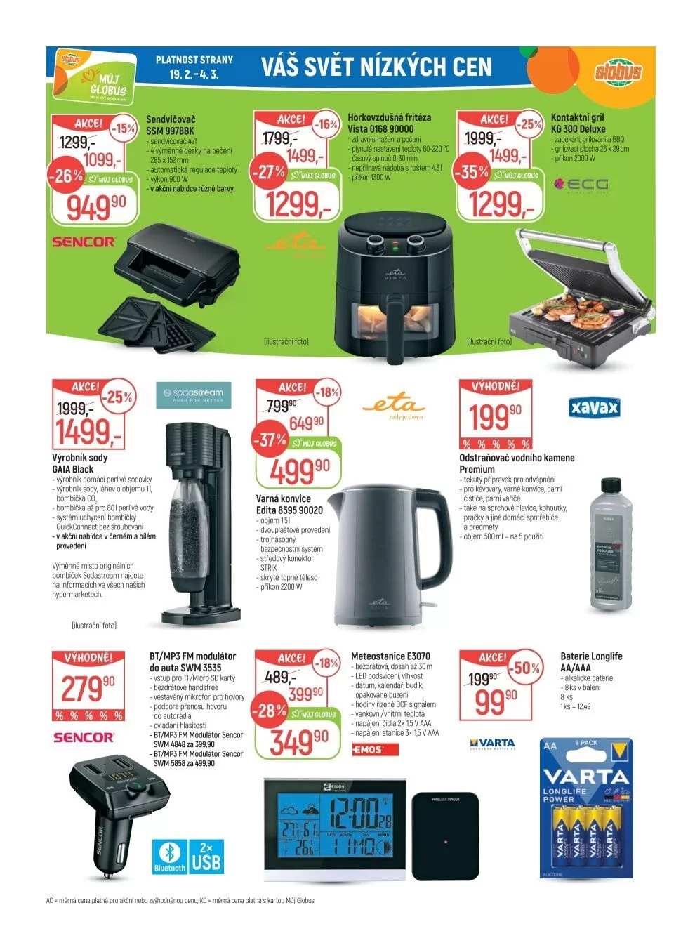 Mezi akčními položkami se objevují sendvičovače za 1099 Kč, varné konvice s objemem 1,5 litru za 1299 Kč a horkovzdušné fritézy s možností zdravého smažení za 1499 Kč.