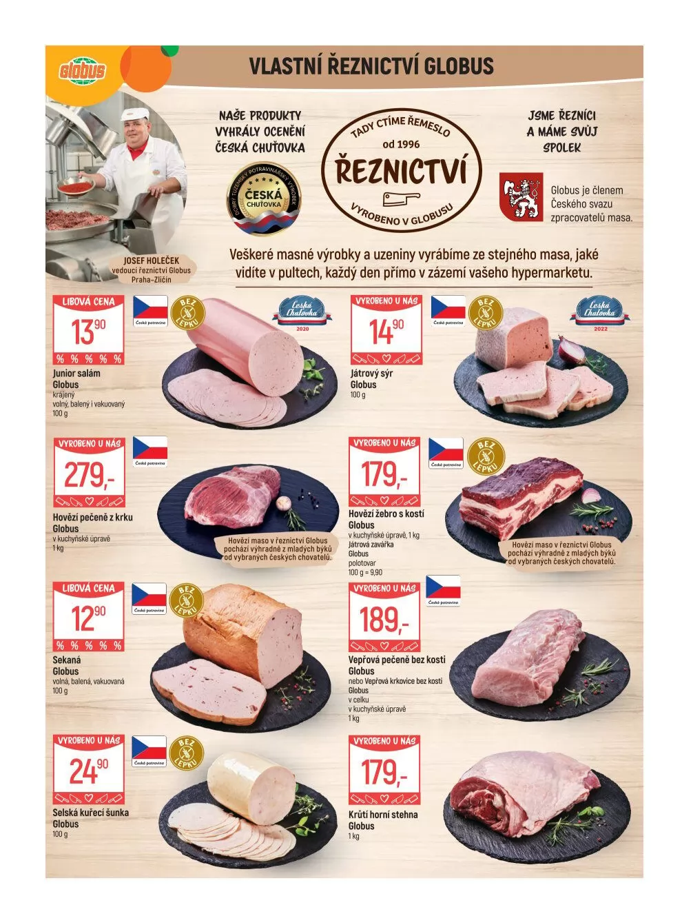 V letáku obchodu Globus najdete širokou nabídku kvalitních masných výrobků z vlastního řeznictví. Naše produkty, jako je česká chuťovka a sekaná, byly oceněny pro svou vynikající kvalitu. Od roku 1996 ctíme tradiční řemeslo a každý den vyrábíme čerstvé uzeniny přímo v zázemí hypermarketu.