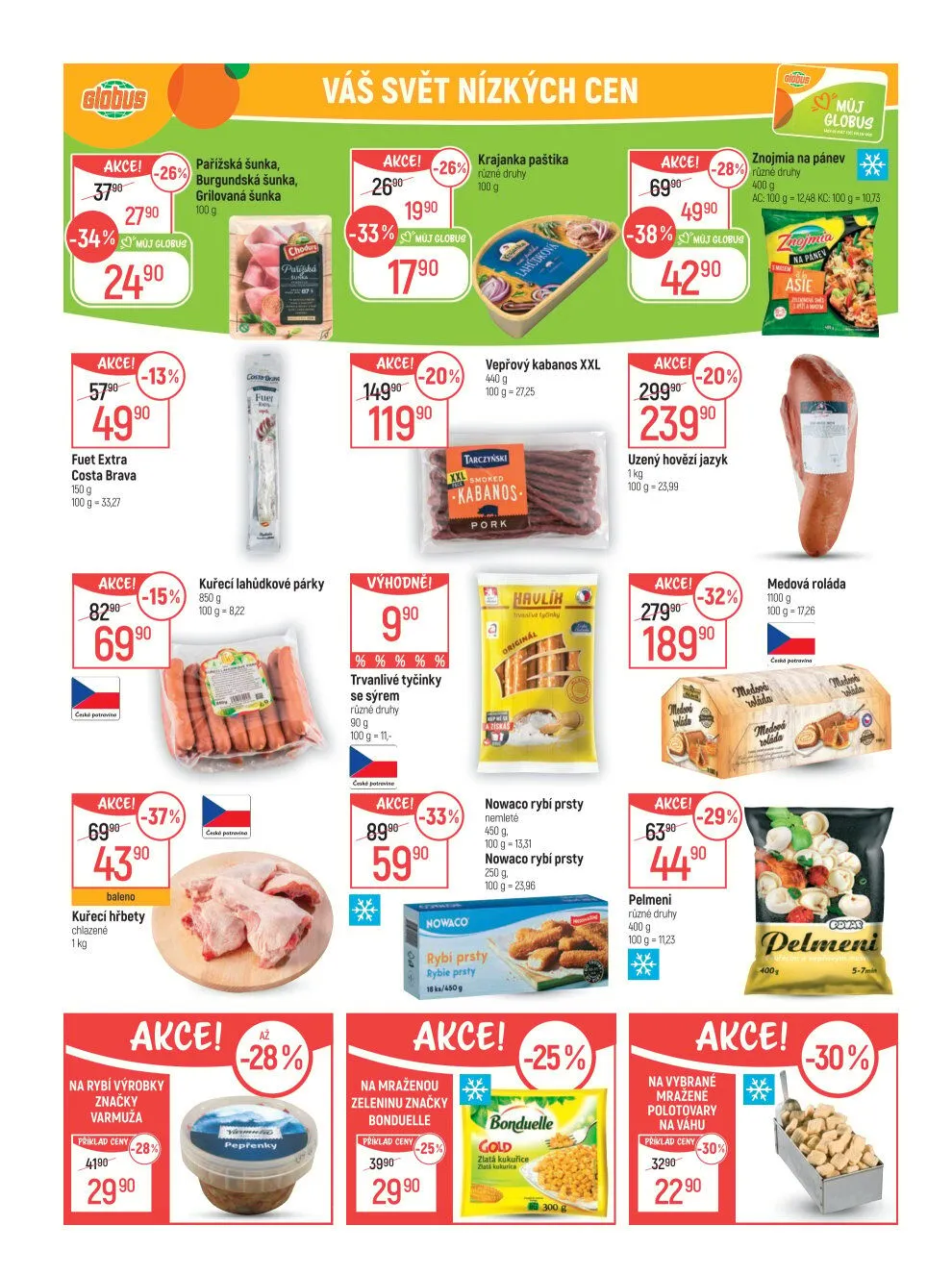 V letáku obchodu Globus najdete širokou nabídku kvalitních produktů za skvělé ceny. Mezi akčními položkami se objevují pařížská a burgundská šunka se slevou až 26%. Dále si můžete vychutnat grilovanou šunku nebo lahodnou krajanku paštiku.