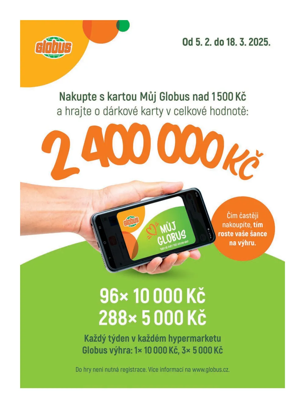 V období od 5.2. do 18.3.2025 máte jedinečnou příležitost hrát o dárkové karty v celkové hodnotě 10 000 Kč! Stačí nakoupit s kartou Můj Globus nad 1 500 Kč a čím častěji nakoupíte, tím větší šanci na výhru máte. Každý týden v každém hypermarketu Globus můžete vyhrát 10 Kč, a navíc 3x 5 000 Kč! Do hry se nemusíte registrovat. Pro více informací navštivte www.globus.cz.