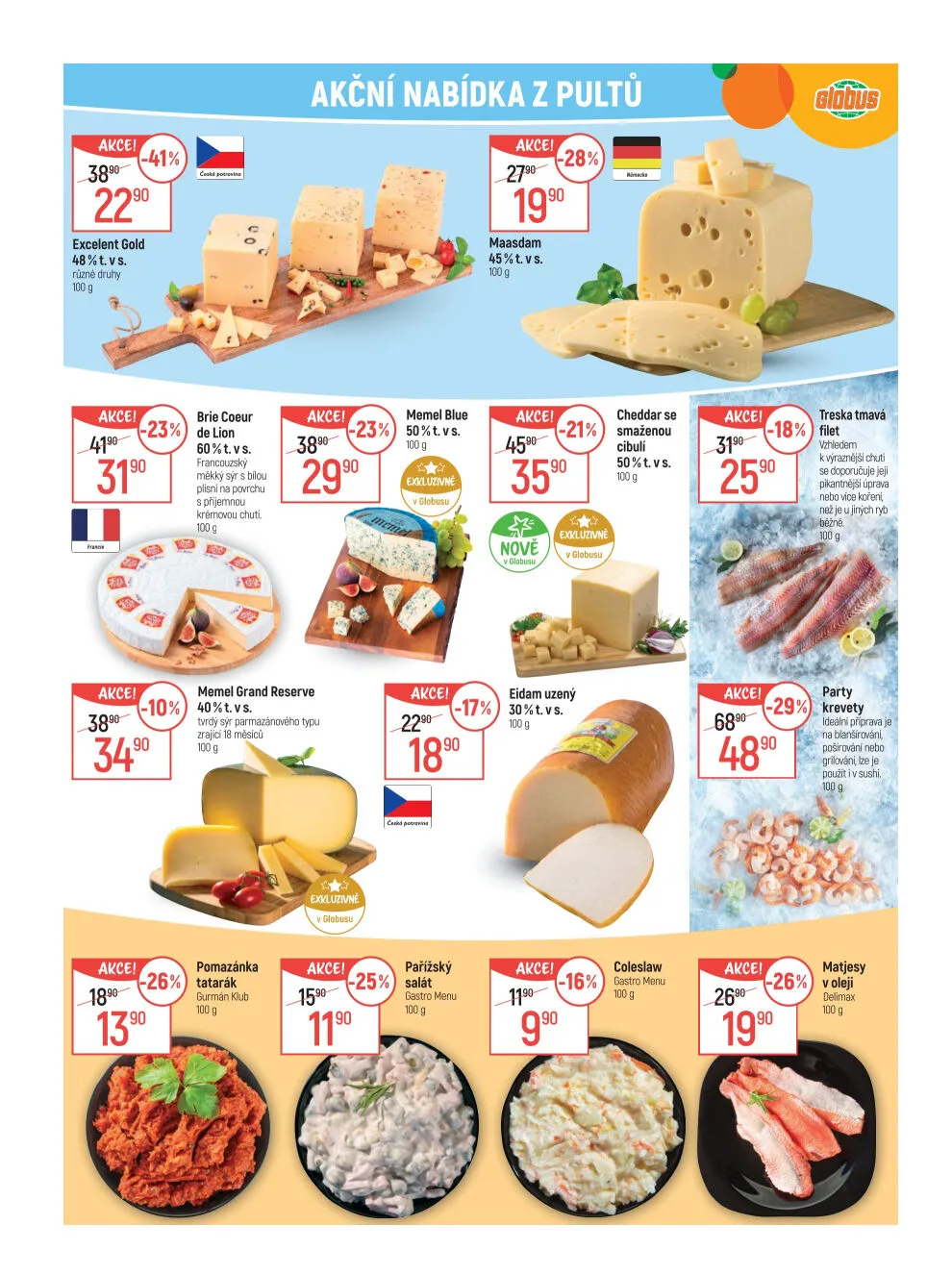 V letáku obchodu Globus najdete skvělé akční nabídky z pultů. Mezi nimi se objevují produkty jako Excelent Gold s 48% tuku, Maasdam s 45% tuku a lahodný Brie Coeur de Lion, francouzský měkký sýr s příjemnou krémovou chutí. Dále si můžete vychutnat Memel Blue s 50% tuku a Cheddar se smaženou cibulí.