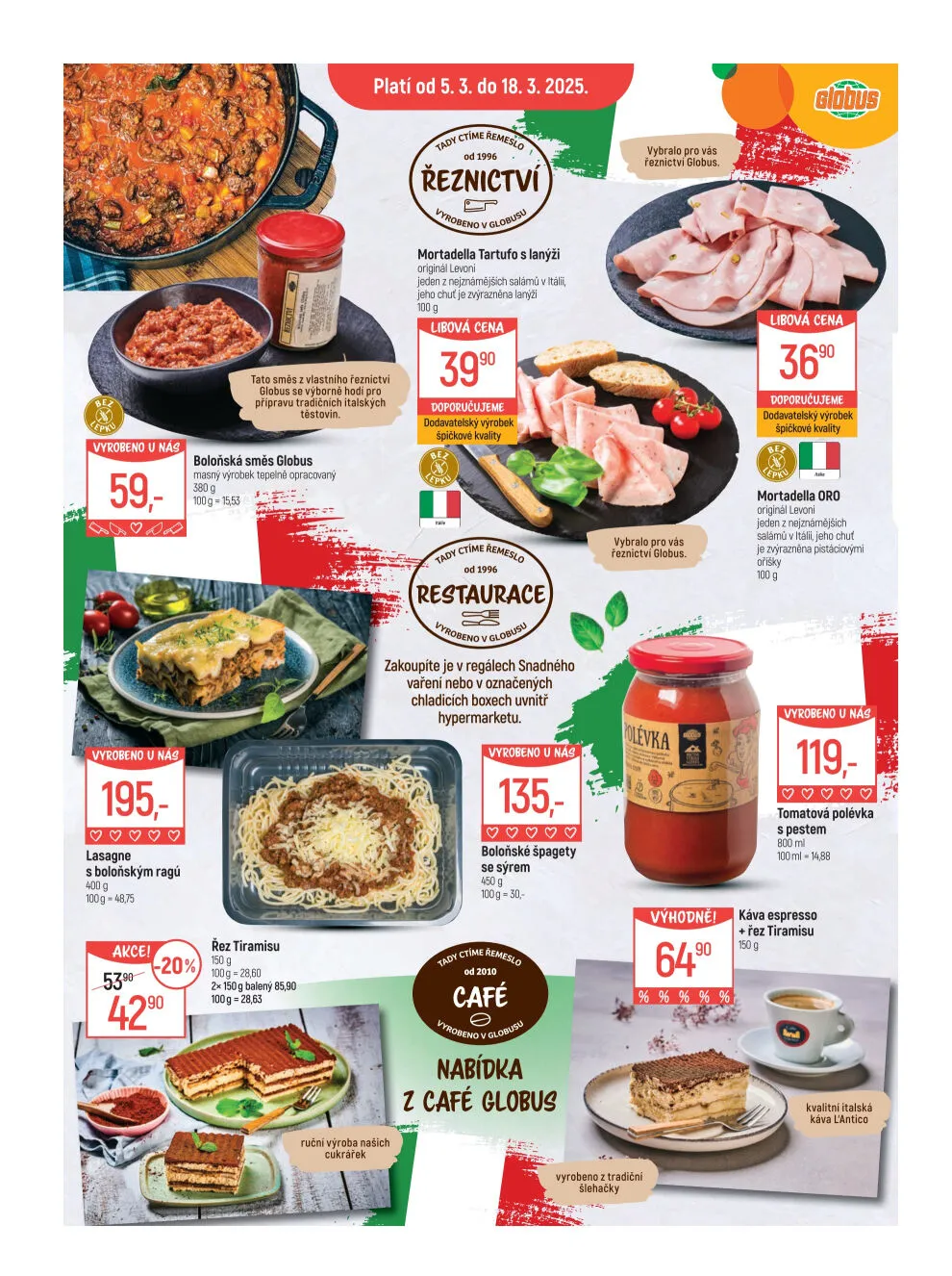 V letáku obchodu Globus najdete skvělé produkty, které potěší vaše chuťové pohárky. Od 5.3. do 18.3.2025 si můžete zakoupit mortadellu tartufo s lanýži, ideální pro přípravu tradičních italských těstovin. Dále nabízíme boloňskou směs a lasagne s boloňským ragú, které jsou vyrobeny z kvalitních surovin.