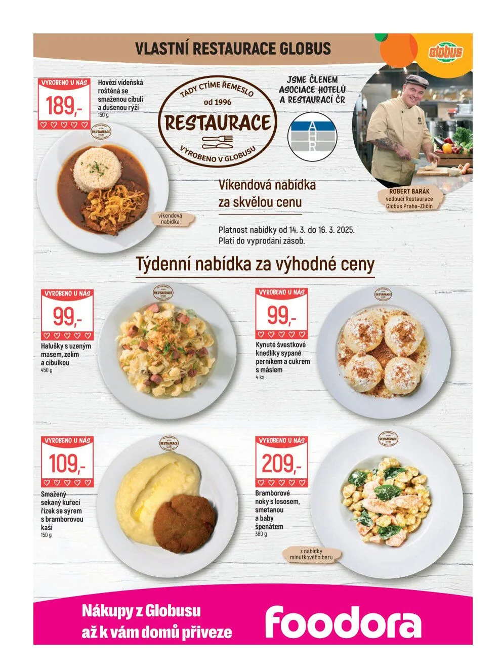 V letáku obchodu Globus najdete skvělou nabídku jídel z vlastní restaurace. Mezi nimi jsou halušky s uzeným masem, zelím a cibulkou za 189 Kč (450 g), sekaný kuřecí řízek se sýrem a bramborovou kaší za 109 Kč (150 g) a hovězí vídeňská roštěná se smaženou cibulkou a dušenou rýží od 199 Kč.