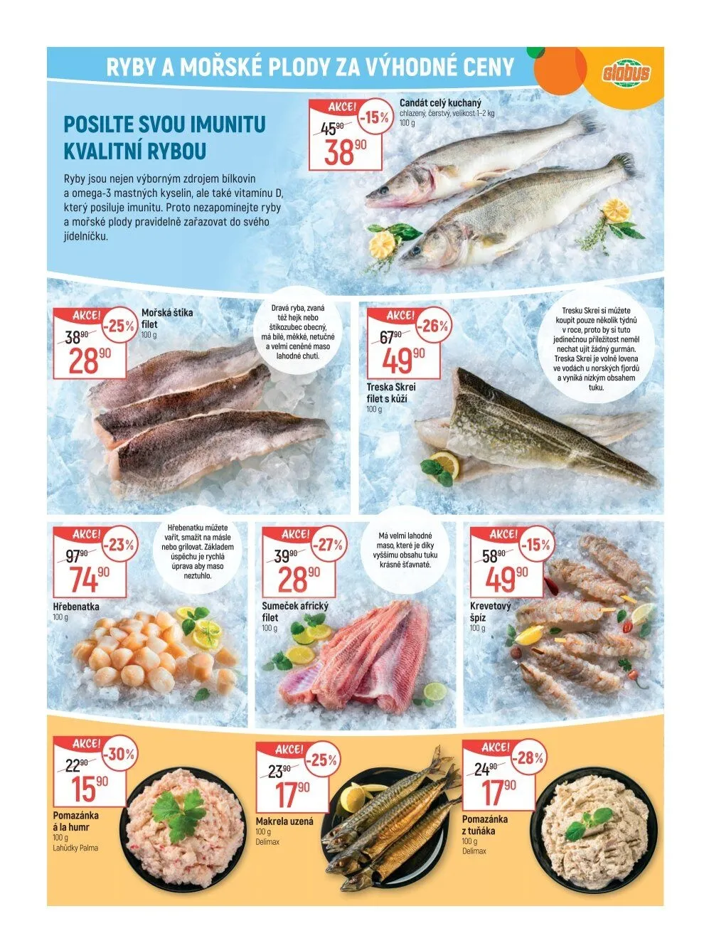 V letáku obchodu Globus najdete širokou nabídku ryb a mořských plodů za výhodné ceny. Posilte svou imunitu kvalitní rybou, která je výborným zdrojem bílkovin a omega-3 mastných kyselin, a také vitaminu D. Nezapomínejte pravidelně zařazovat ryby a mořské plody do svého jídelníčku.