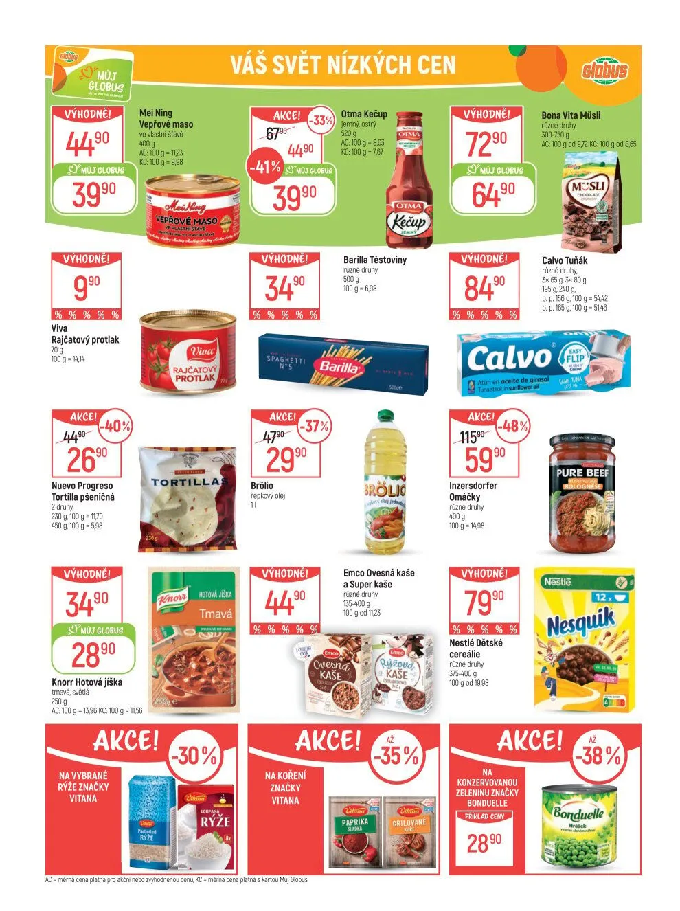 V letáku obchodu Globus najdete širokou nabídku výhodných produktů. Mezi nimi se objevují rajčatový protlak Viva v akci za 39,90 Kč za 100 g a vepřové maso Mei Ning ve vlastní šťávě. Nezapomeňte také na kečup Arce, který je k dostání v různých variantách, včetně ostrého, za 44,90 Kč za 520 g.