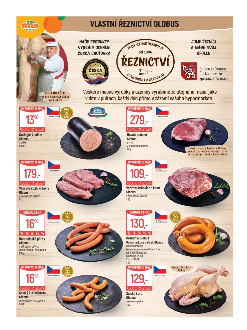 V letáku obchodu Globus najdete širokou nabídku kvalitních masných výrobků z vlastního řeznictví. Naše produkty ctí tradici a kvalitu, což dokazuje i řada ocenění, která jsme získali. Mezi oblíbené položky patří gothajský salám, vepřový řízek krájený, debrecínské párky a selské kuře. Všechny naše masné výrobky a uzeniny jsou vyráběny z masa, které vidíte přímo v našich pultech, a to každý den v zázemí hypermarketu. Naše hovězí maso pochází výhradně z mladých býků od vybraných českých chovatelů. Navštivte nás a ochutnejte kvalitu, kterou nabízíme!