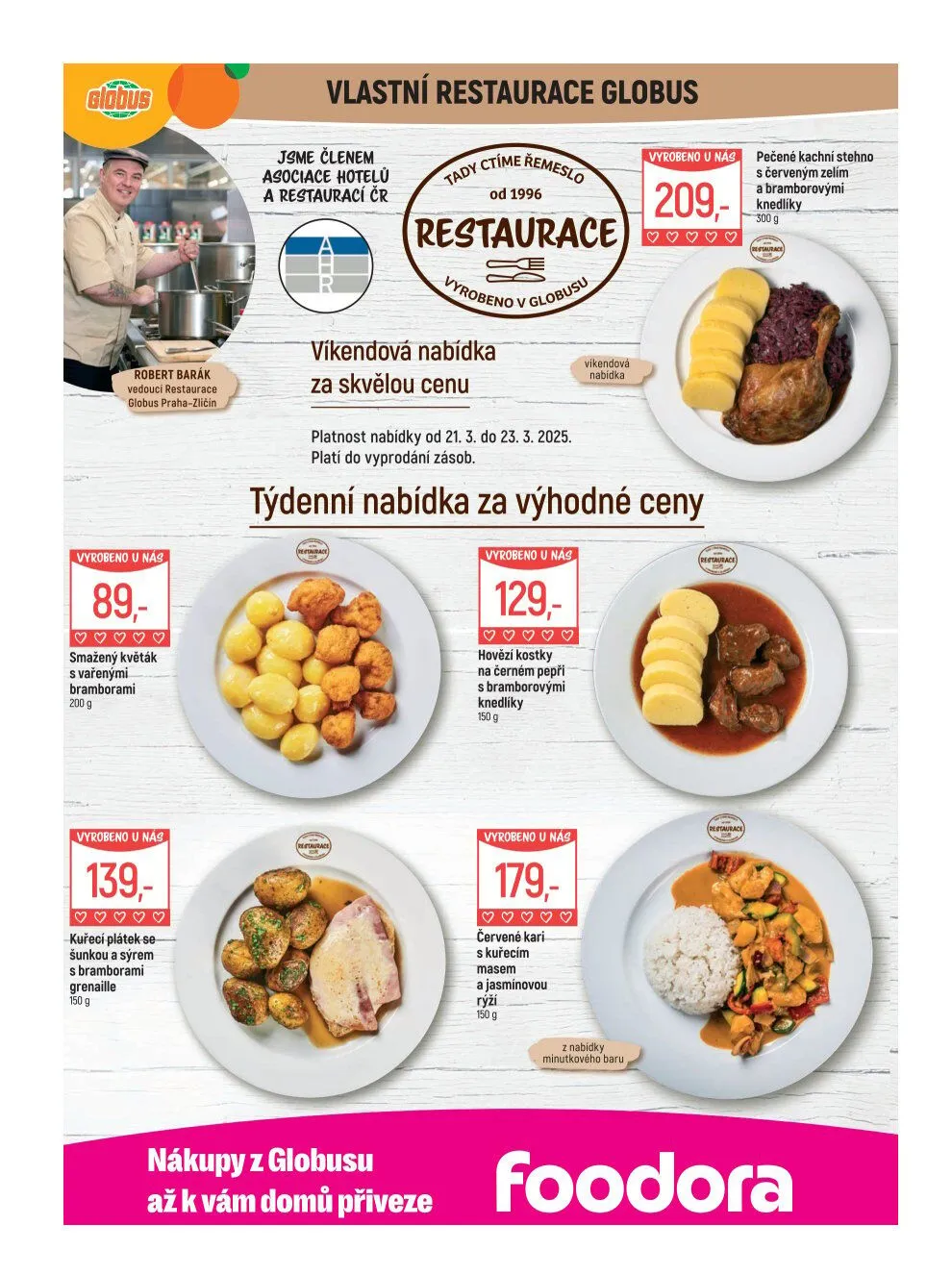 V letáku obchodu Globus najdete skvělou nabídku pokrmů z vlastní restaurace. Mezi lákavé speciality patří pečené kachní stehno s červeným zelím a bramborovým knedlíkem za 209 Kč. Dále si můžete pochutnat na smaženém květáku s vařenými bramborami za 89 Kč nebo na plátku masa se šunkou a sýrem s bramborami grenaille za 139 Kč.