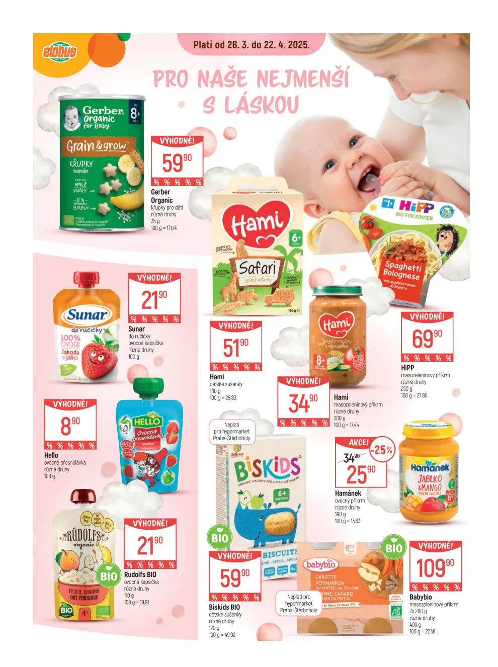 V letáku obchodu Globus najdete širokou nabídku produktů pro nejmenší. Nabízíme křupky Gerber organic v různých druzích, které jsou ideální pro malé děti. Dále si můžete vybrat z ovocných kapsiček Sunar s příchutí jahody a jablka, nebo z různých druhů přesnídávek Hello.