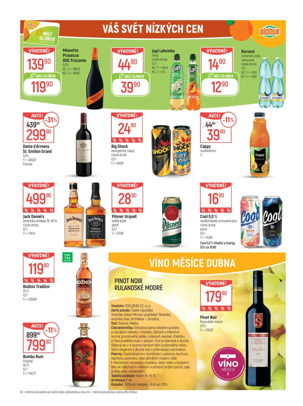 V letáku obchodu Globus najdete širokou nabídku výhodných produktů za nízké ceny. Mezi nimi se objevují oblíbené nápoje jako Jack Daniels, Bumbu rum a Božkov tradiční. Nezapomeňte také na víno měsíce dubna - Pinot Noir, které se skvěle hodí k pečené kachně nebo jehněčímu masu.