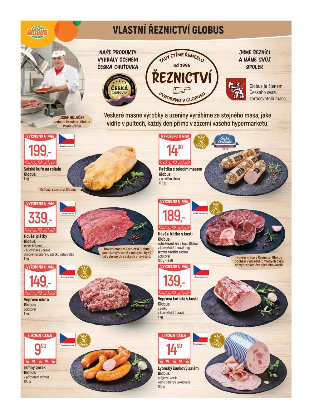 V našem řeznictví Globus nabízíme široký výběr kvalitních masných výrobků, které získaly ocenění za svou chuť. Od roku 1996 ctíme tradiční řemeslo a každý den vyrábíme naše produkty přímo v zázemí hypermarketu.