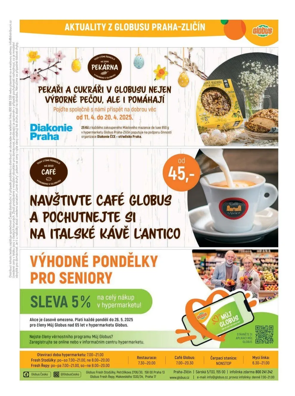 V letáku obchodu Globus Praha-Zličín najdete skvělé nabídky a akce, které potěší každého zákazníka. Naše pekárna nabízí výborné máslové mazance de luxe, přičemž část výtěžku jde na podporu Diakonie. Navštivte také Café Globus a vychutnejte si italskou kávu Lantico.